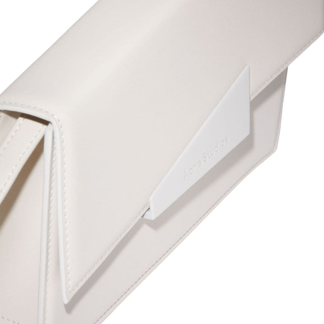 The design of the bag is marked by its distinctively sculptural silhouette. The front flap closure, adorned with the iconic Acne Studios logo embossed discreetly, adds a touch of refinement to the piece. The sleek hardware, whether in polished silver or matte black, complements the overall aesthetic, offering a hint of modern edge.