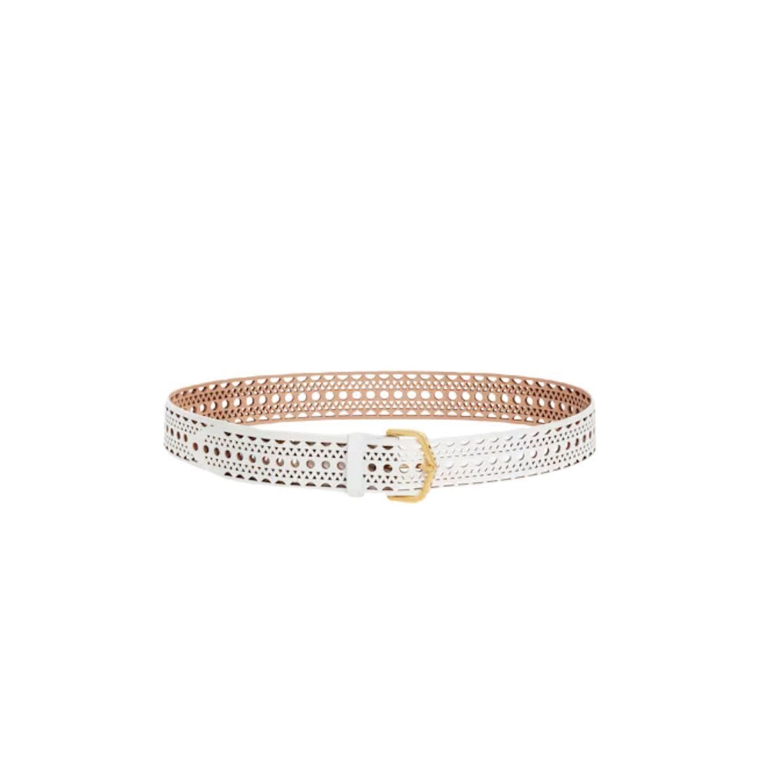 The Neo Vienne Belt is designed with an intricate laser-cut pattern that is both modern and timeless, reflecting Alaïa’s unique approach to design. This pattern, known as “Vienne,” features an array of delicate geometric shapes that create a visually captivating lace-like effect, showcasing the brand’s innovative techniques in leatherwork. The precision of the cutouts adds a touch of femininity and intricacy, making it a statement piece that enhances any ensemble.