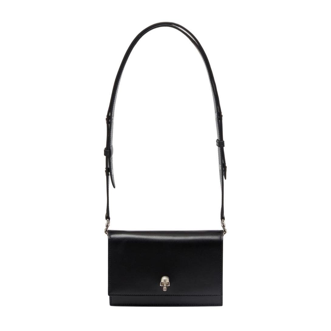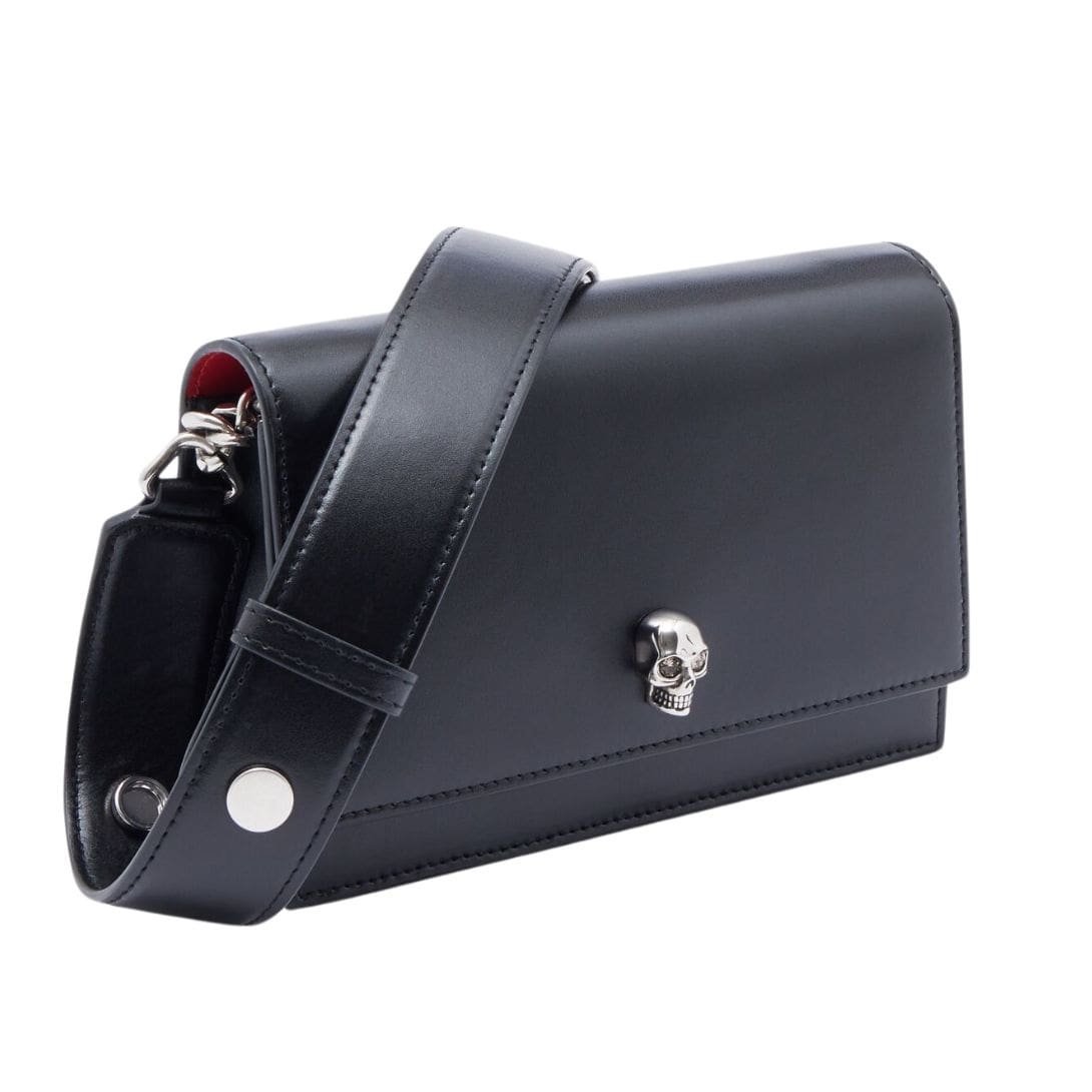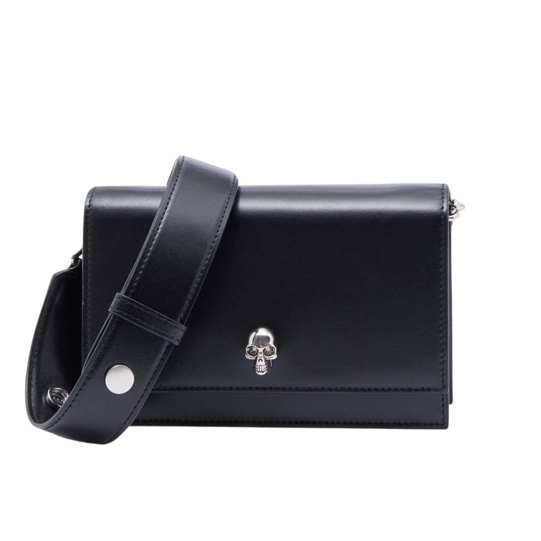 This Alexander Mcqueen Womans Small Skull In Black features a convenient magnetic fastening for easy access. Inside, it boasts one central compartment and a card slot, perfect for organizing your essentials. The interior is lined with luxurious leather, enhancing its premium feel.