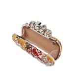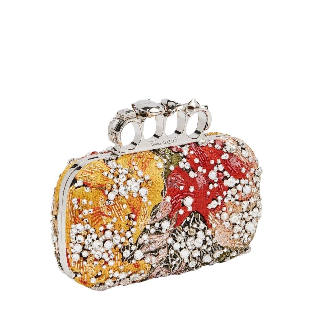 Alexander McQueen Women’s Knuckle Clutch in Multicolor featuring a Multicolour Flower crystal embroidery and a handle adorned with punk-inspired rings. The clutch can be worn either hand-held or over the shoulder using its chain strap.