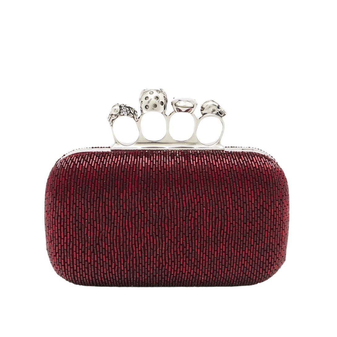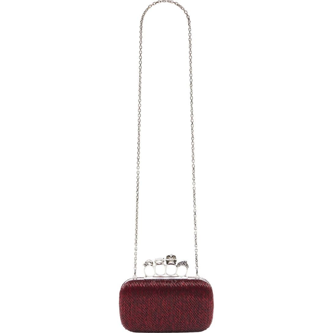 Introducing our exquisite Alexander McQueen Women’s Knuckle Clutch in red, featuring an all-over red bugle embroidery and a handle adorned with crystal-encrusted rings. This versatile clutch can be worn either hand-held or over the shoulder using its chain strap.