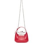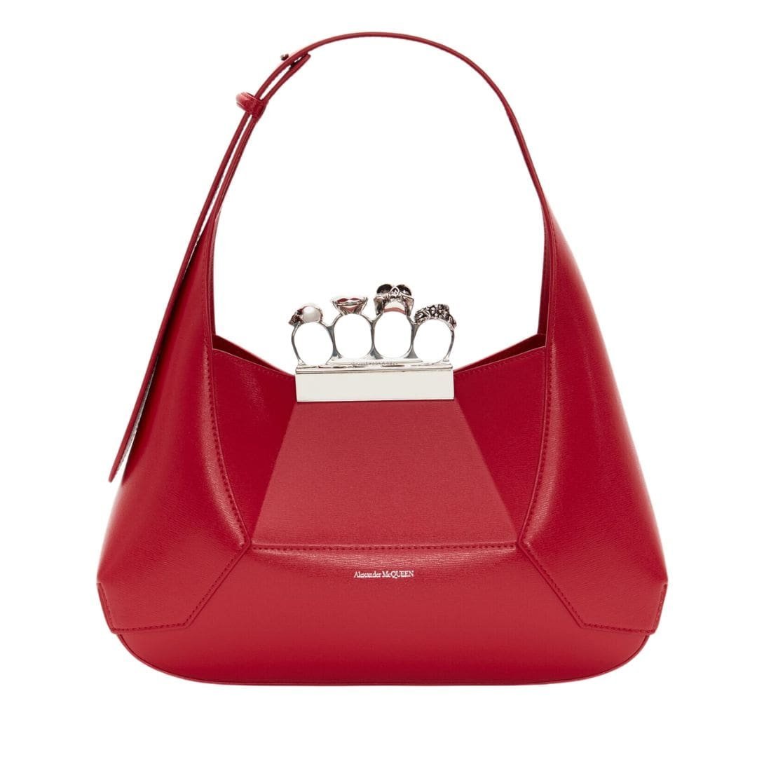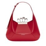 Introducing the Alexander McQueen Women’s the Jewelled Hobo bag in welsh red, crafted from smooth calfskin leather with an antique silver-finished handle adorned with crystal-encrusted rings. Inspired by the faceted stone on the Knuckle, its unique silhouette features leather panels that are intricately cut and re-assembled.