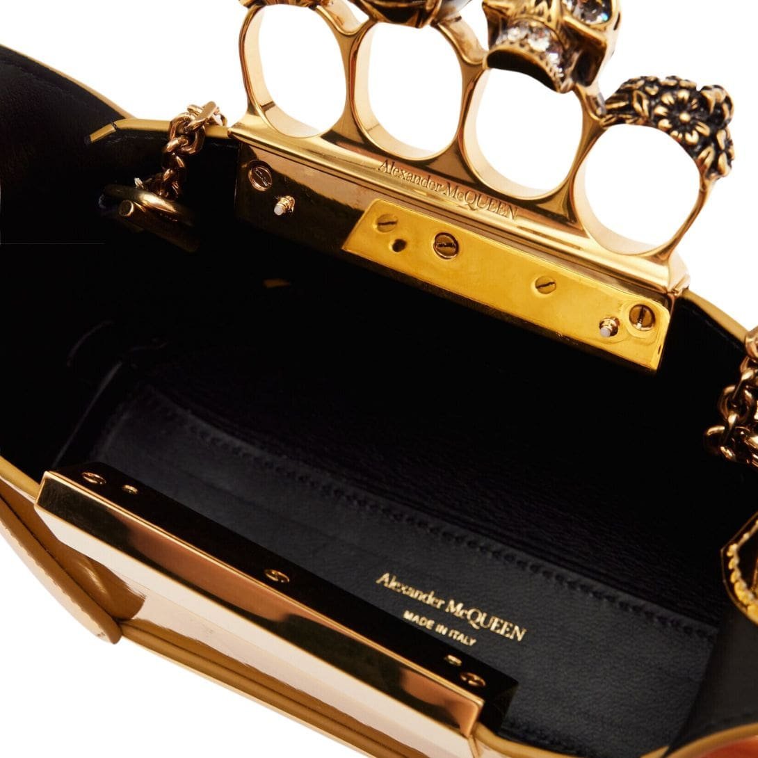 Gold-tone metallic fabric Alexander McQueen Women’s the Jewelled Hobo mini bag in gold featuring an antique gold-finished handle adorned with crystal-encrusted rings. The unique silhouette of the Jewelled Hobo is inspired by the faceted stone that sits on the Skull Four Ring and features fabric panels that are cut and reassembled together. This bag can be worn either hand-held, over the shoulder, or across the body with its detachable chain.