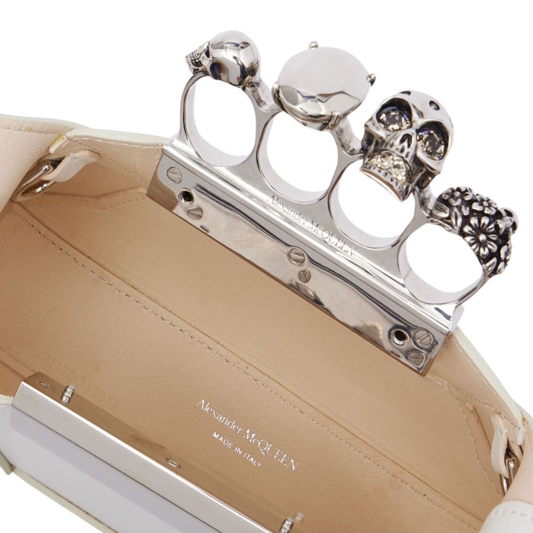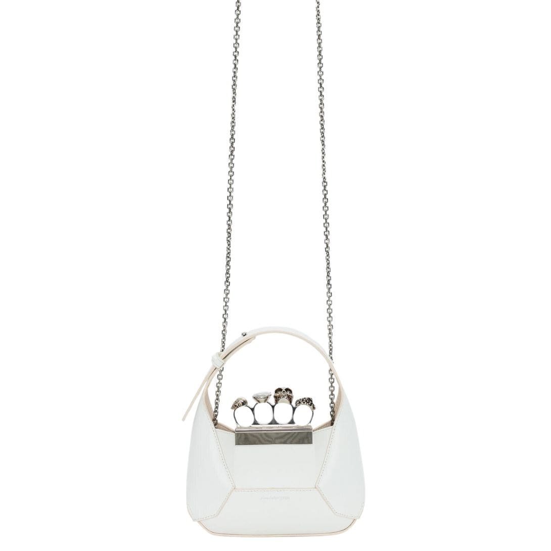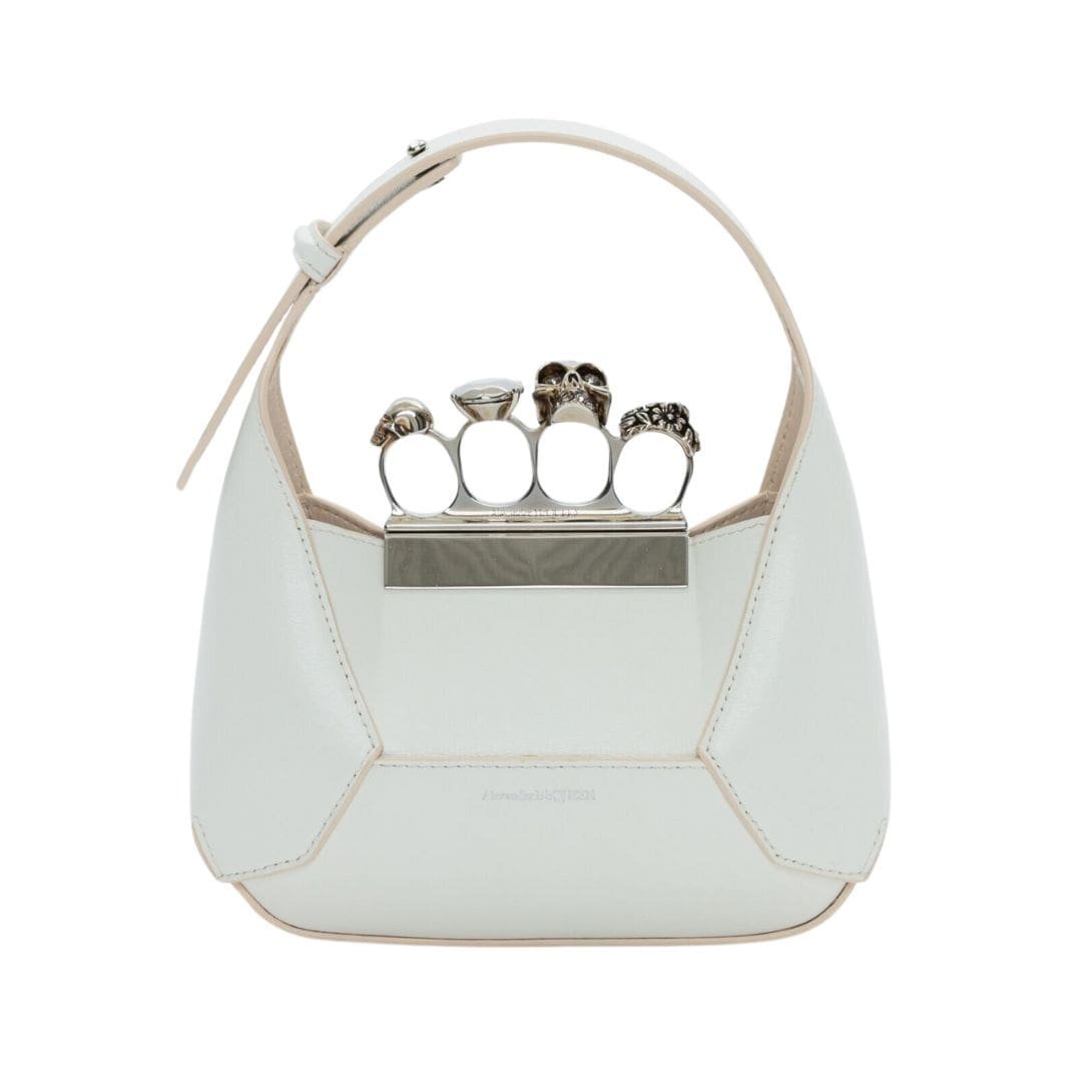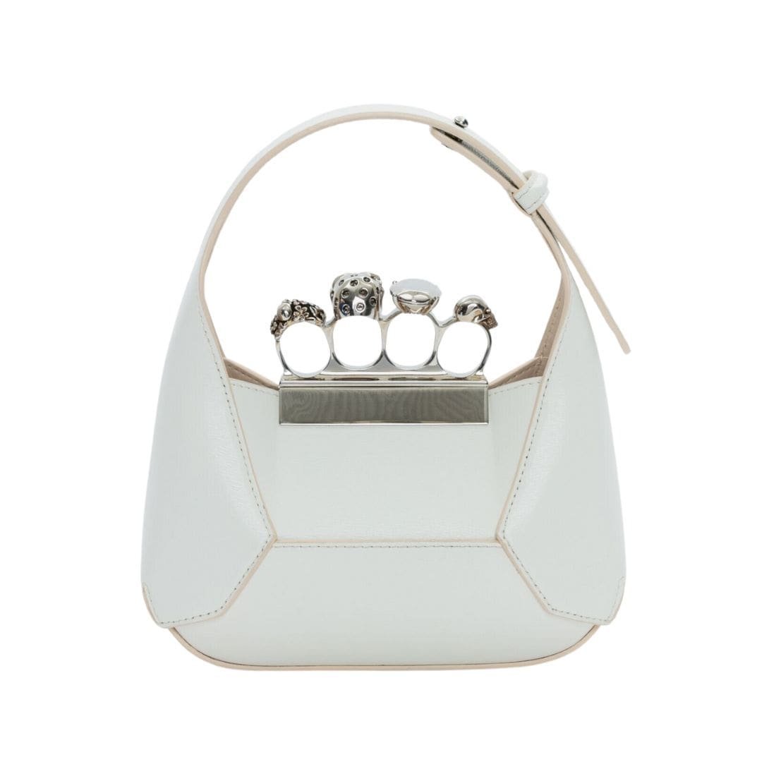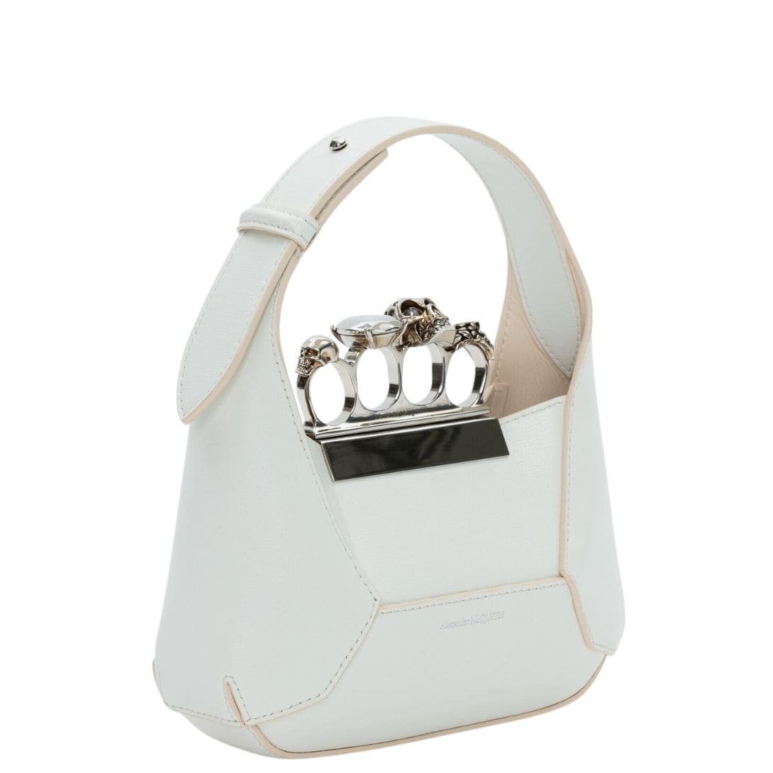 Introducing the Alexander McQueen Women’s the Jewelled Hobo mini bag in ivory, crafted from smooth ivory calfskin leather with an antique silver-finished handle adorned with crystal-encrusted rings. Inspired by the faceted stone on the Knuckle, its unique silhouette features leather panels that are intricately cut and re-assembled.