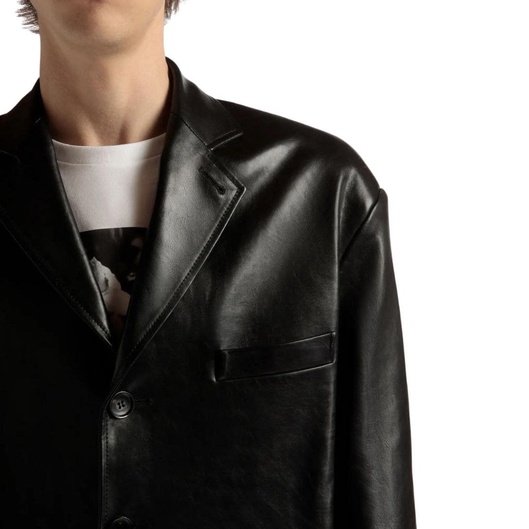 Sleek and versatile, the jacket features a supple yet durable black leather exterior that exudes refinement and refinement. The rich texture of the leather lends an air of exclusivity, while its buttery softness ensures comfort and ease of movement. Meticulously tailored to perfection, the jacket boasts a flattering silhouette that accentuates the wearer’s physique with understated elegance.