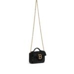 - Introducing the Balmain B-Buzz mini velvet and crystal bag, a captivating accessory that effortlessly combines luxury with glamour. Straps: Features a handle and an adjustable detachable shoulder strap for versatile carrying options. Closure: Secured with a flap adorned with a magnetic B clasp crafted from metal and intertwined leather, adding a touch of sophistication. Interior: Includes a card pocket for convenient storage of essentials.