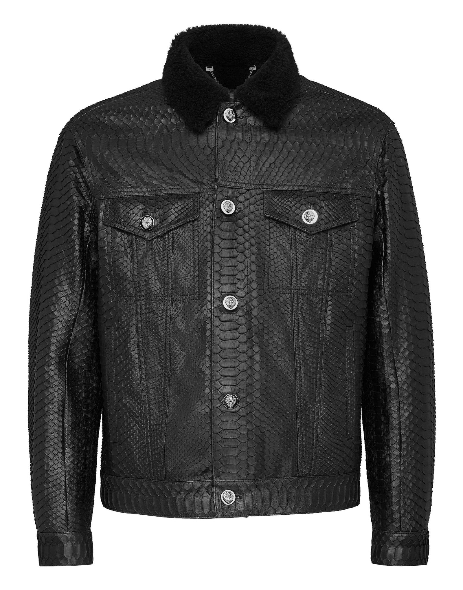 Presenting the Billionaire Leather Jacket with Python Luxury, a luxurious rendition of a classic staple. Elevating traditional craftsmanship, this jacket boasts a sheepskin-lined collar secured with a single press stud for added comfort.