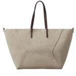 Refined materials and artisanal craftsmanship imbue this Brunello Cucinelli Cotton and Linen Canvas shopper bag with Monili with a sophisticated yet summery touch. The “raw” texture of the cotton and linen canvas fabric presents a dry, slightly mottled appearance, contrasting with the smooth surface of the leather used for the wide handles, making carrying the accessory easy. Two small Monili details on the sides complete the design. Additionally, two internal ties allow the bag’s shape to be modified for a more compact look when fastened.