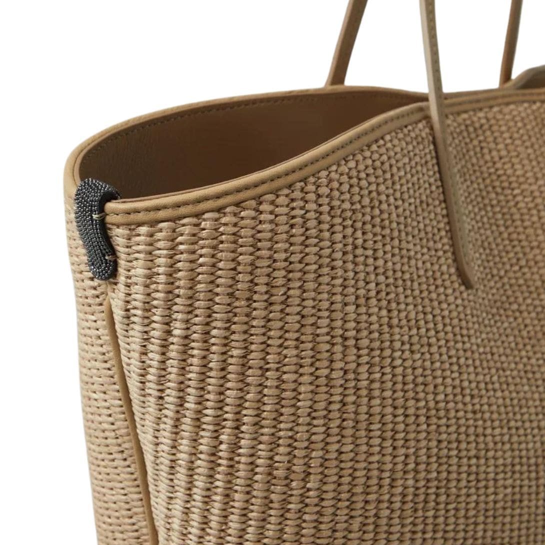 - The Brunello Cucinelli Techno Cotton Raffia Shopper Bag with Monili offers a summery allure while updating its essential silhouette.