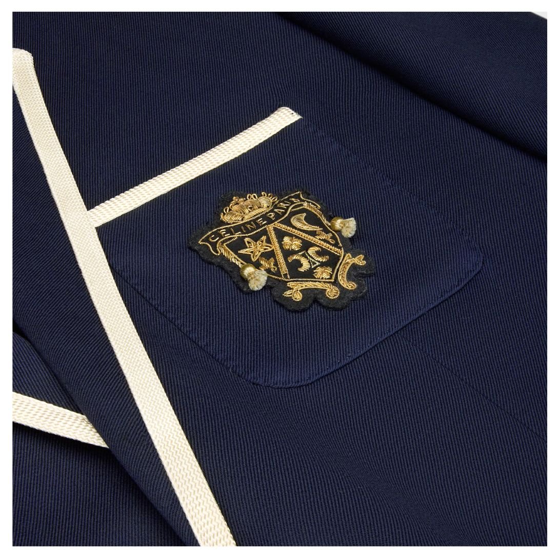 Braided piping details enhance the sophisticated aesthetic, while a middle back vent ensures ease of movement. The blazer is finished with Celine Blason buttons, featuring two on the front and four on the cuffs, adding a distinctive signature touch.