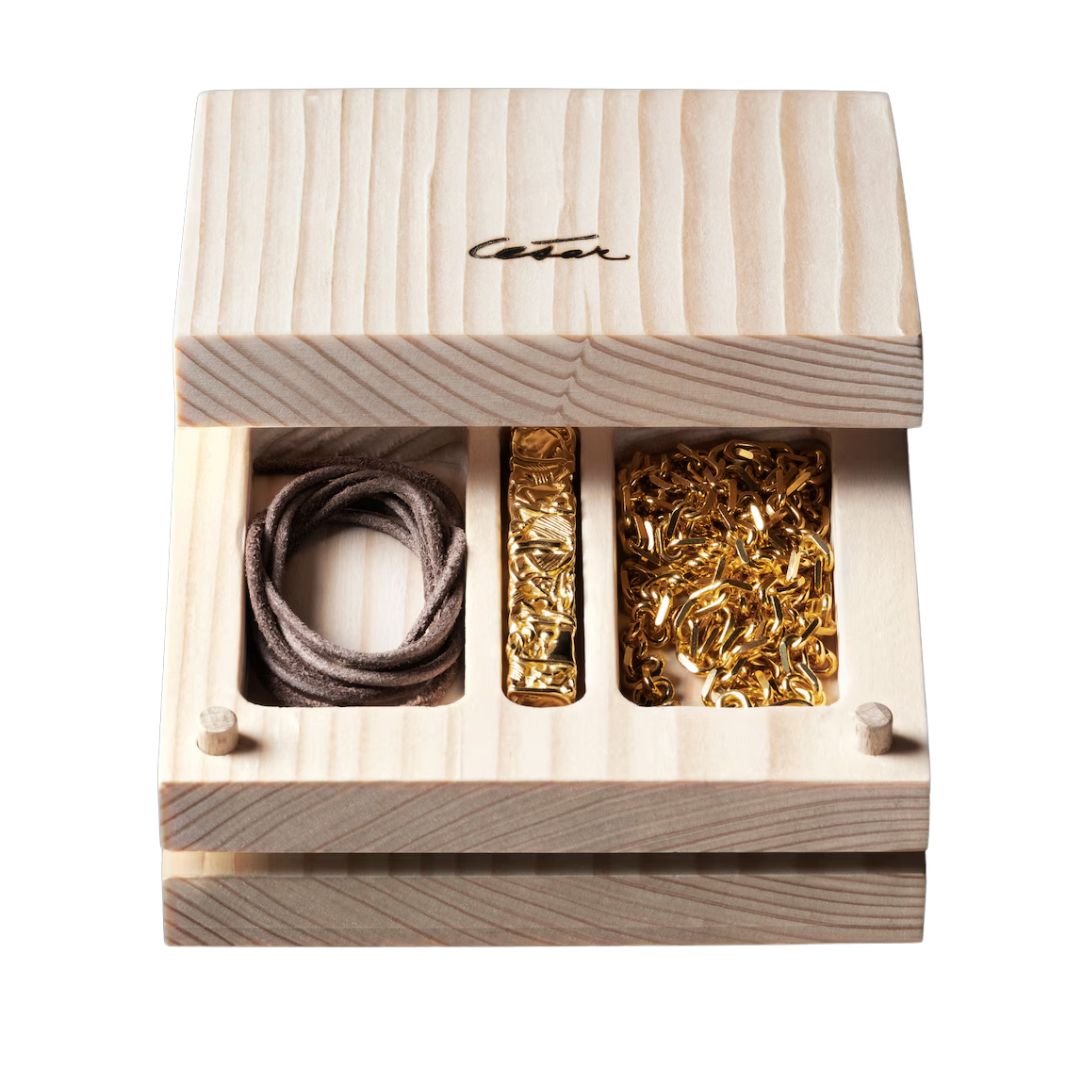 This limited-edition necklace is crafted from vermeil and leather, combining the brilliance of precious metal with the soft, supple texture of fine leather. The contrast between these materials creates a refined yet bold statement piece.