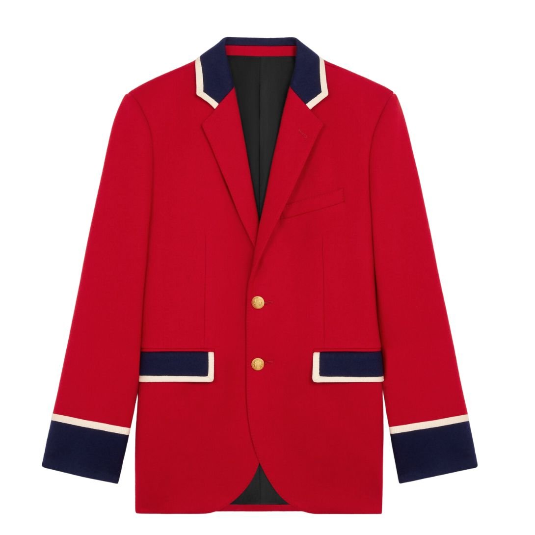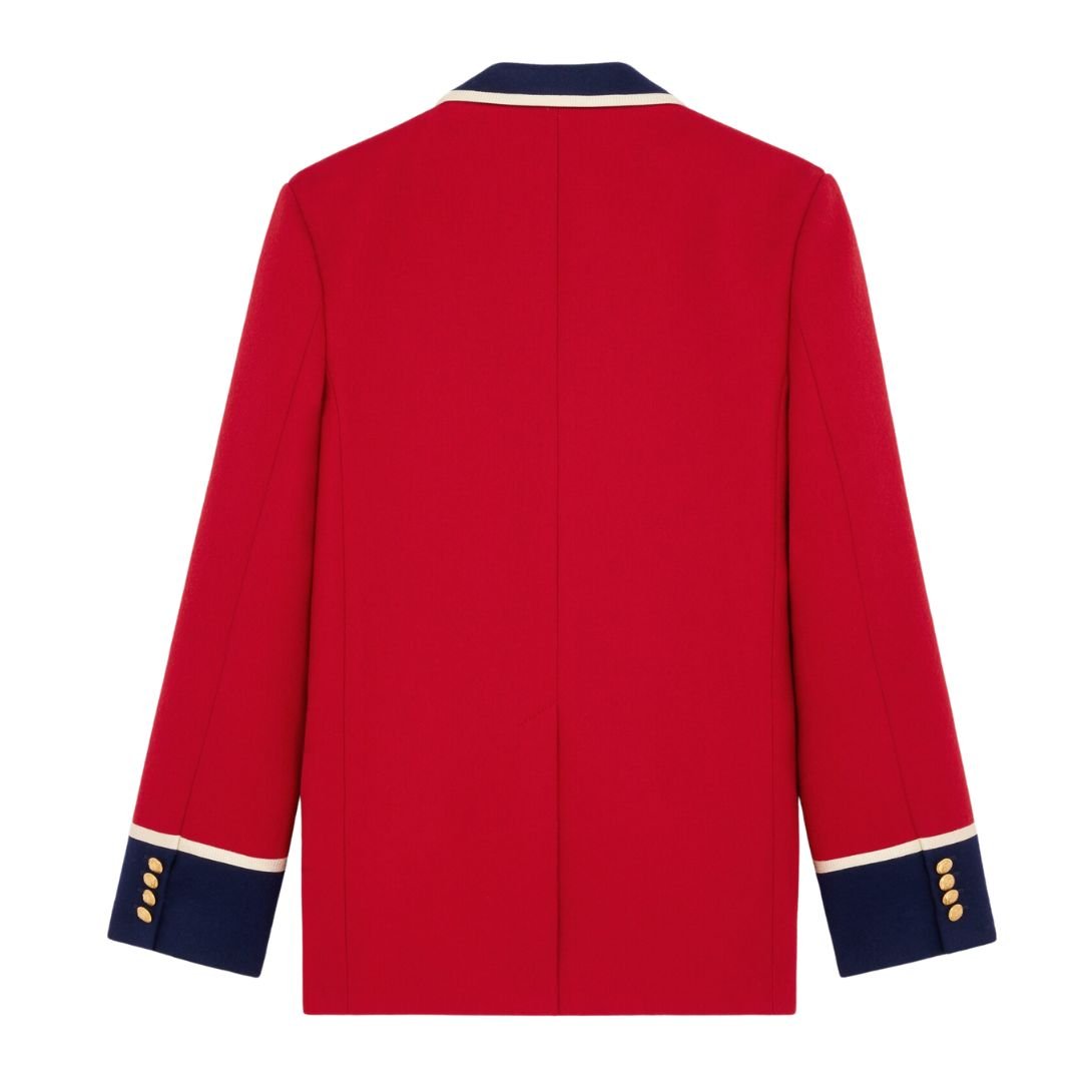 Braided piping details add a sophisticated accent, while the middle back vent ensures ease of movement and comfort. The blazer is adorned with two Celine Blason buttons on the front and four matching buttons on the cuffs, reinforcing its distinguished aesthetic.