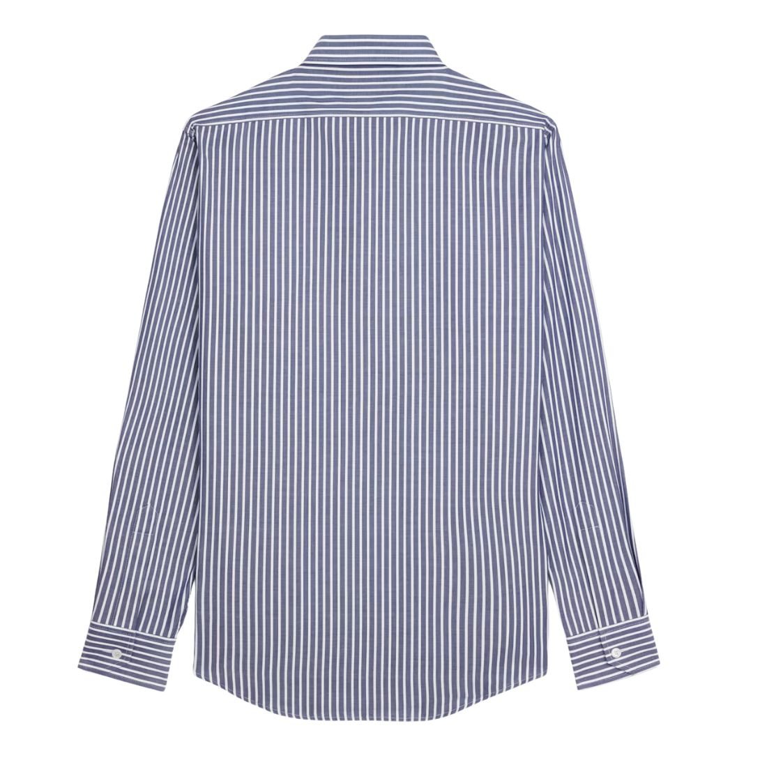 The drugstore collar, reinforced with collar stays, maintains a crisp, structured look, adding a touch of refinement.