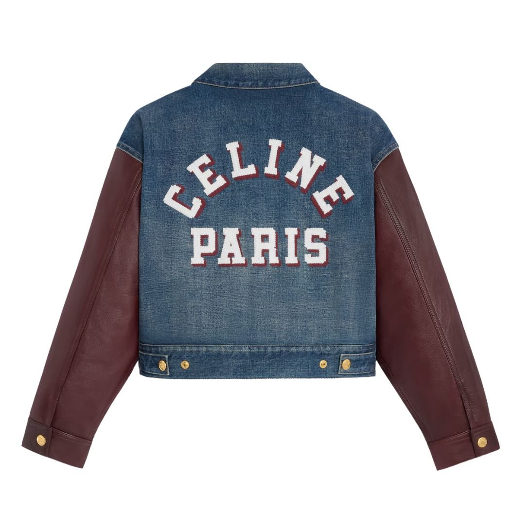Equipped with 2 welt pockets, 2 waist adjustment tabs, and contrasting leather sleeves, this jacket blends practicality with high fashion. The Triomphe snap button closure—including 5 front buttons, 1 on the cuffs, and 1 on the adjustment tabs—adds a signature finishing touch.