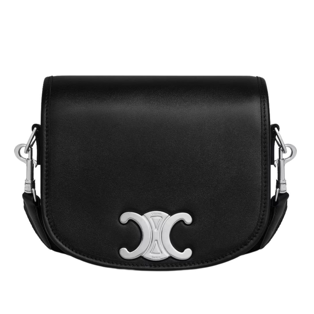 The front flap is adorned with a decorative metallic Triomphe accent and secured with a discreet snap button closure, offering a perfect balance of elegance and practicality.