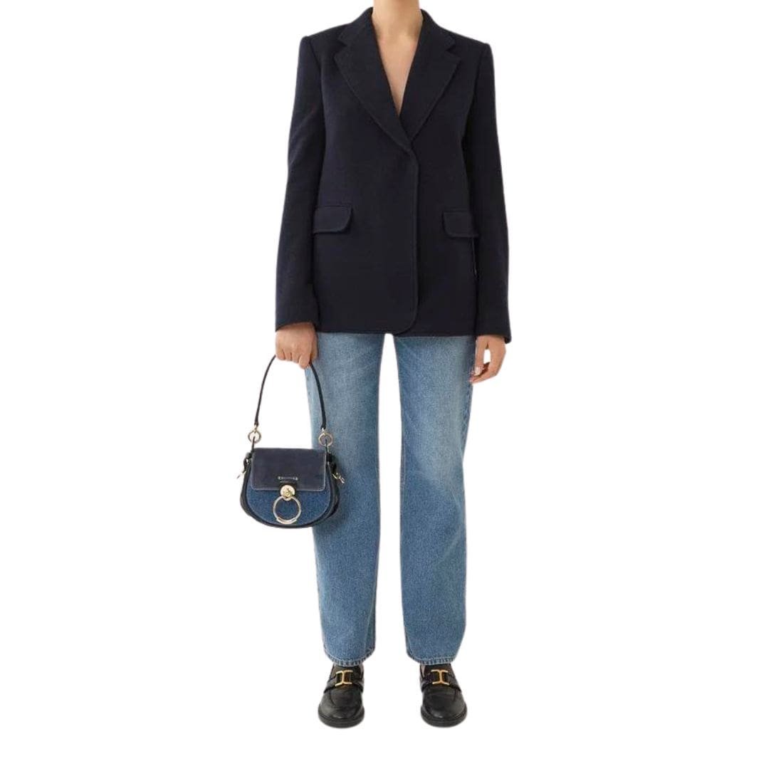 Crafted with meticulous attention to detail, the Chloe Small Tess Bag Denim. epitomizes sophistication and versatility. Its elegant combination of shiny calfskin and suede calfskin creates a luxurious texture that exudes timeless charm. The bag’s round silhouette, a hallmark of Chloe’s design ethos, reflects the brand’s DNA with grace and poise.