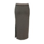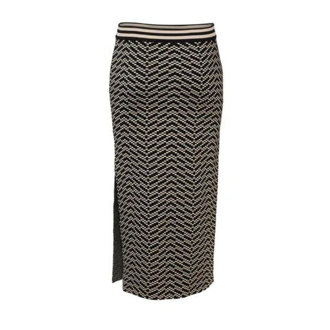 The dodo bar or Assa Skirt’ is skillfully crafted from geometric jacquard knit, featuring a striped elasticated waistband and a stylish side slit.