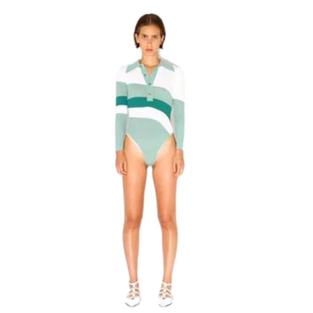 The Dodo Bar Or Hera Bodysuit is crafted from ribbed knit, ensuring a snug fit with a point collar and front button accents.