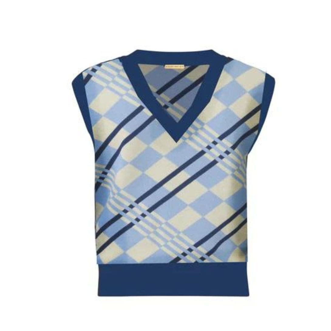 The Dodo Bar OR Lola Sweater Vest is crafted from pure wool and features a graphic geometric print in a blue geometric-jacquard knit design.