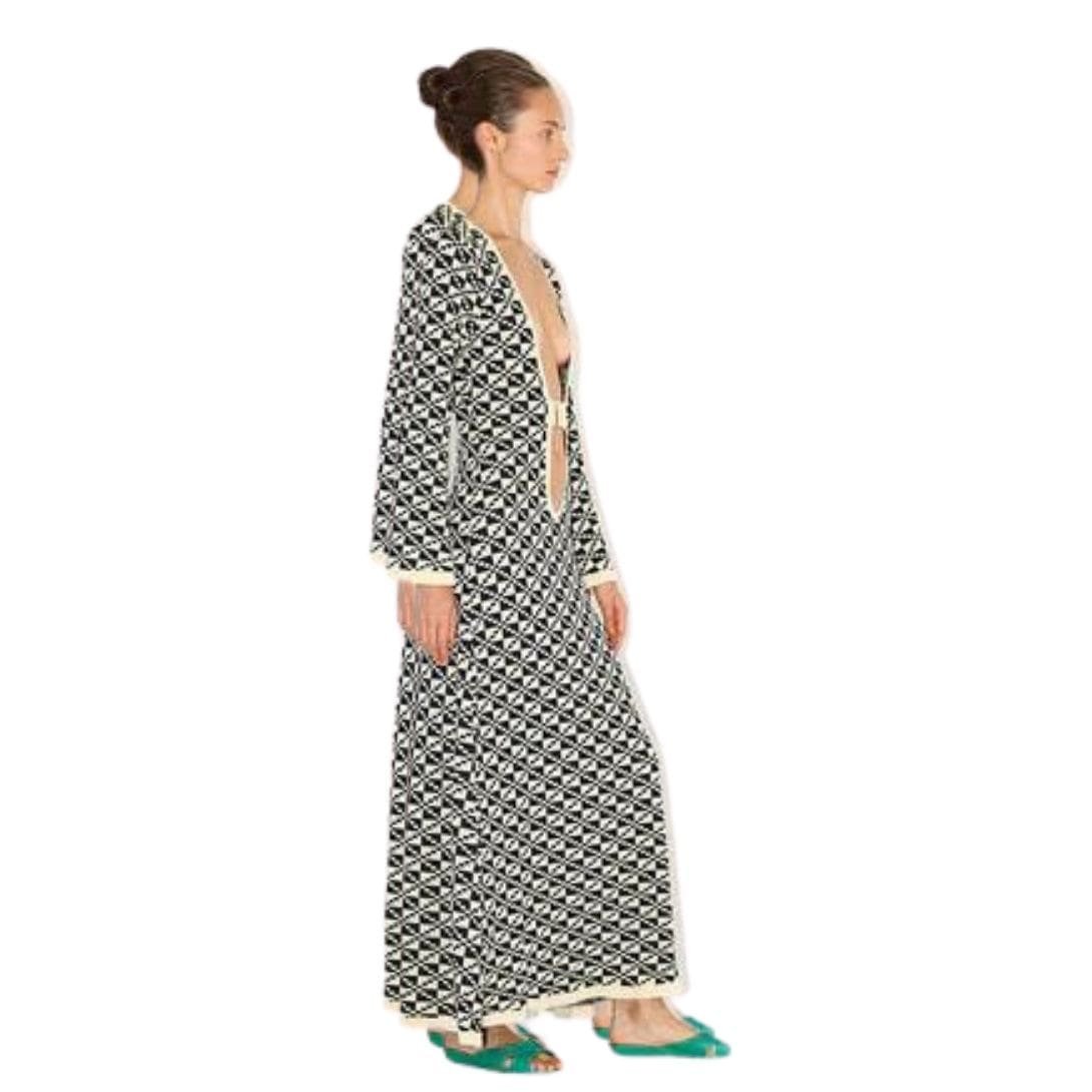 The Dodo Bar OR Lori Dress’ is crafted in a relaxed silhouette, featuring a plunging neckline held together by a gold buckle and adorned with fluted sleeves.