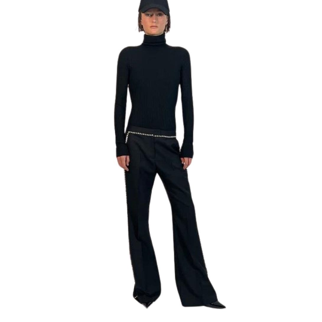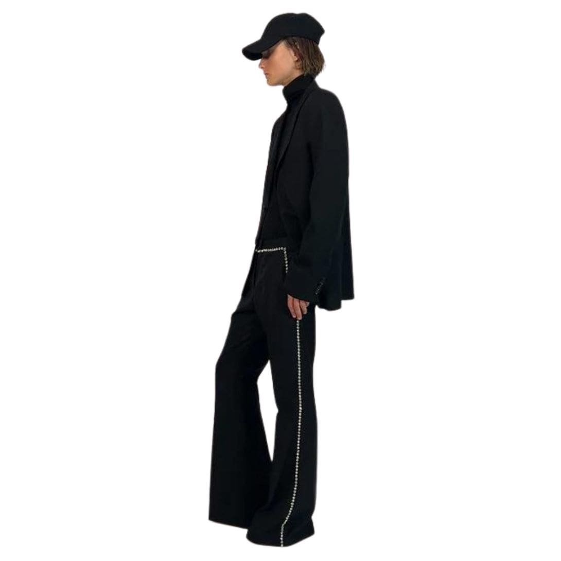 The Dodo Bar OR Mark Pants Crafted with a mid-rise waist, the Mark Pants feature slim legs that flare out at the ankles. They are designed with smart pressed creases at the front and embellished with a crystal chain around the belt and side seams.