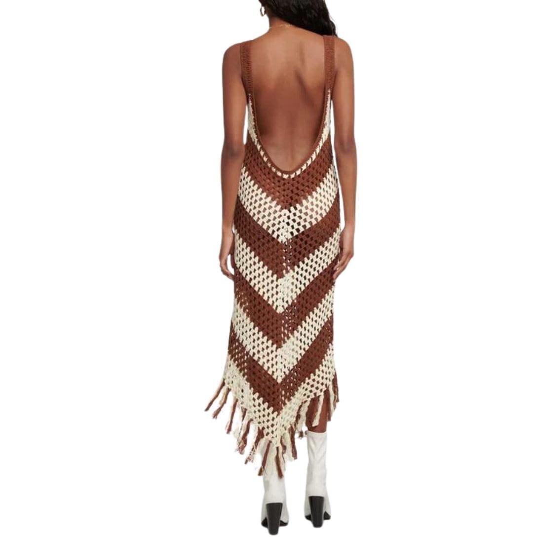 The Dodo Bar OR Morten Dress is delicately crocheted from lightweight cotton, featuring chevron stripes and tasseled edges. It has a round neck and an open back.