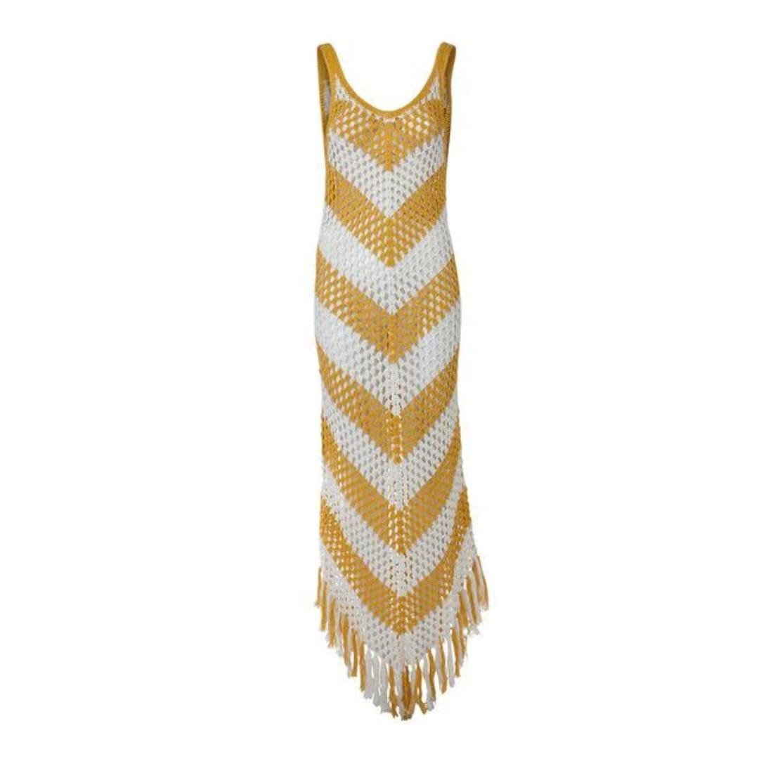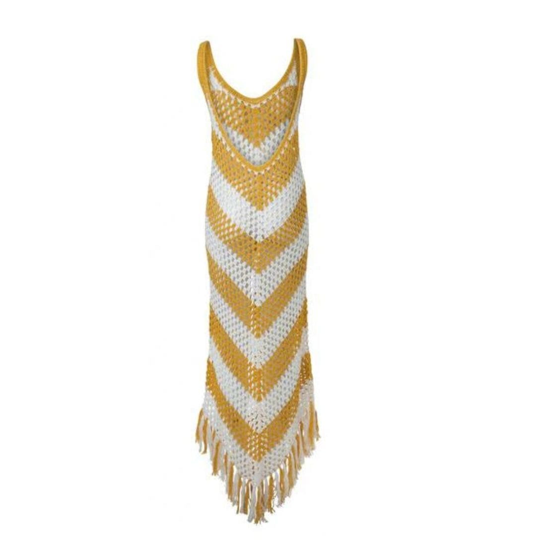 The Dodo Bar OR Morten Dress is delicately crocheted from lightweight cotton, featuring chevron stripes and tasseled edges. It has a round neck and an open back.
