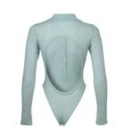 The Dodo Bar or Pollie Bodysuit is tailored for a snug fit, featuring a ribbed knit, a collar, a buttoning top, and a distinctive cut-out back detail.