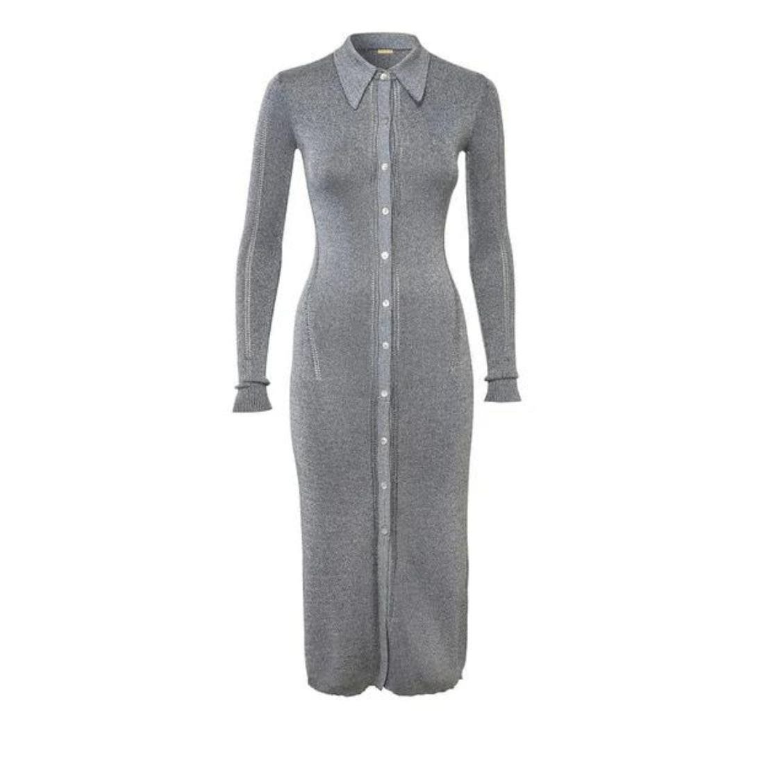 The Dodo Bar OR Rihanna Dress is crafted from a Lurex knit, designed for a relaxed fit with a point collar and button-down fastening through the front.