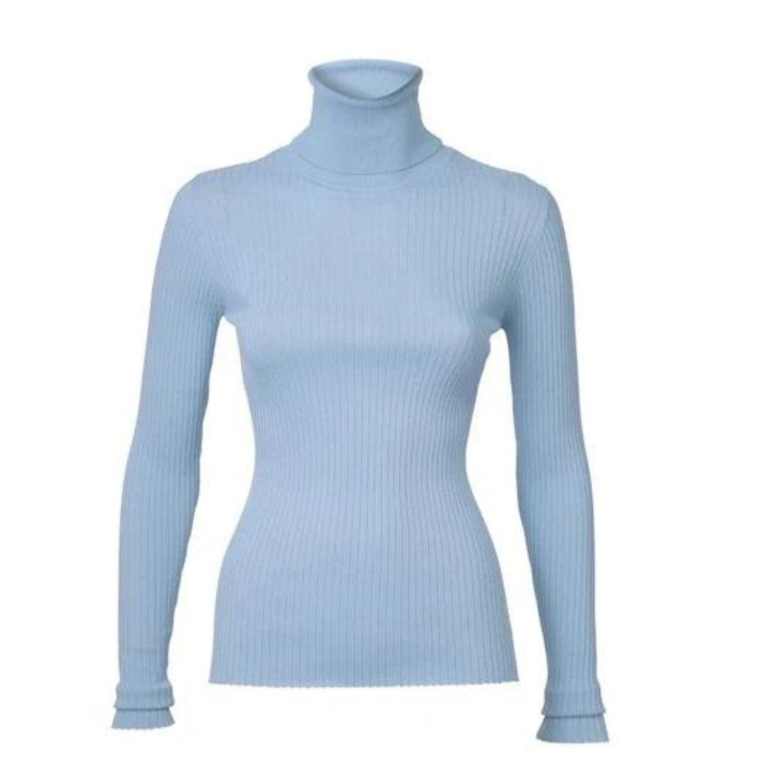 The Dodo Bar or Stacy Turtleneck is crafted from a blend of 85% viscose and 15% nylon, featuring a tight fit with a turtleneck and ribbed detailing.