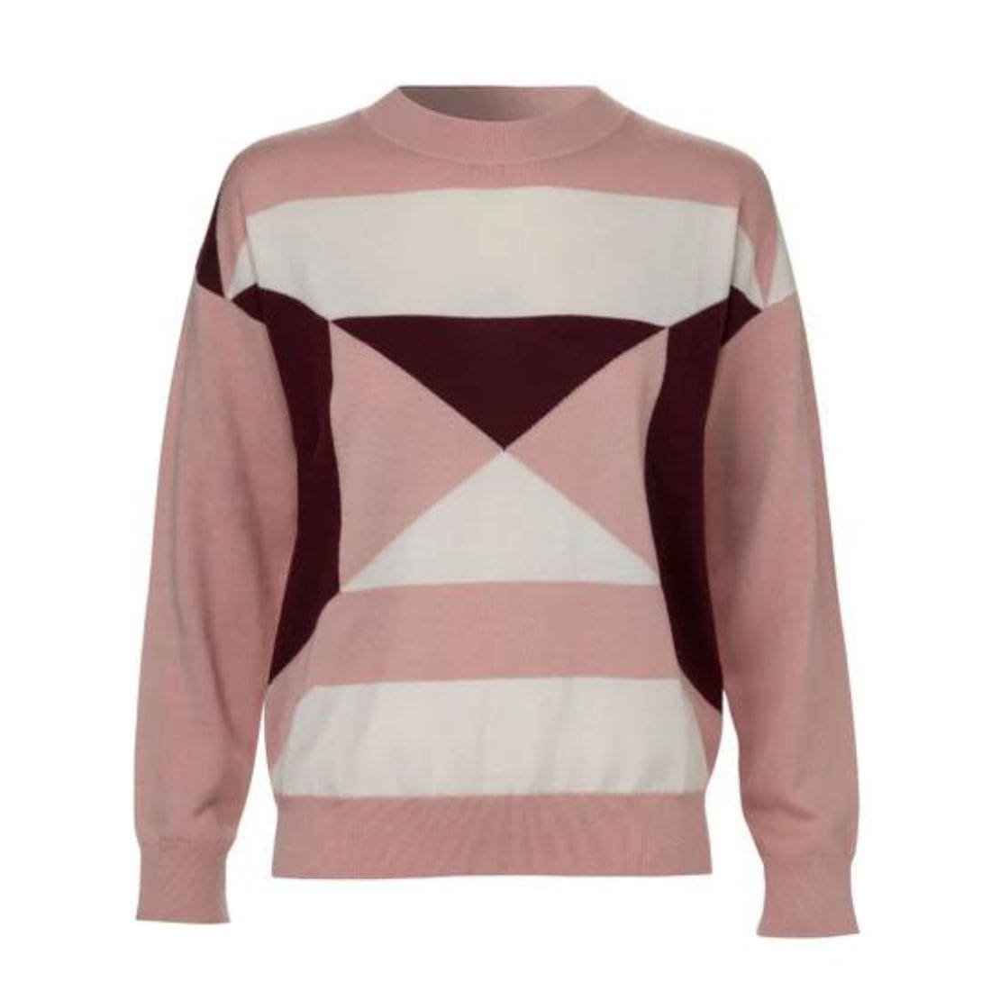 The dodo bar or Stav Sweater ‘ features an intarsia wool blend with graphic geometric prints.