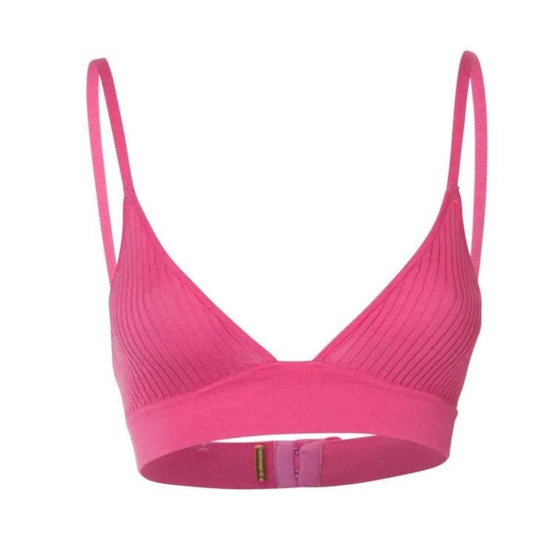 The Dodo Bar or Willa V Knit Bra’ is made from lightweight ribbed fabric, featuring triangle cups and a thick underband for added support. It includes adjustable spaghetti straps and a back hook-and-eye closure.