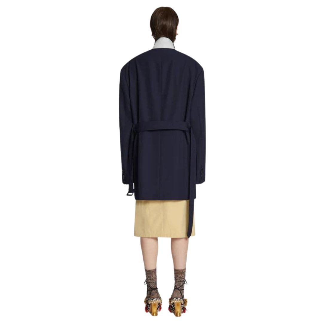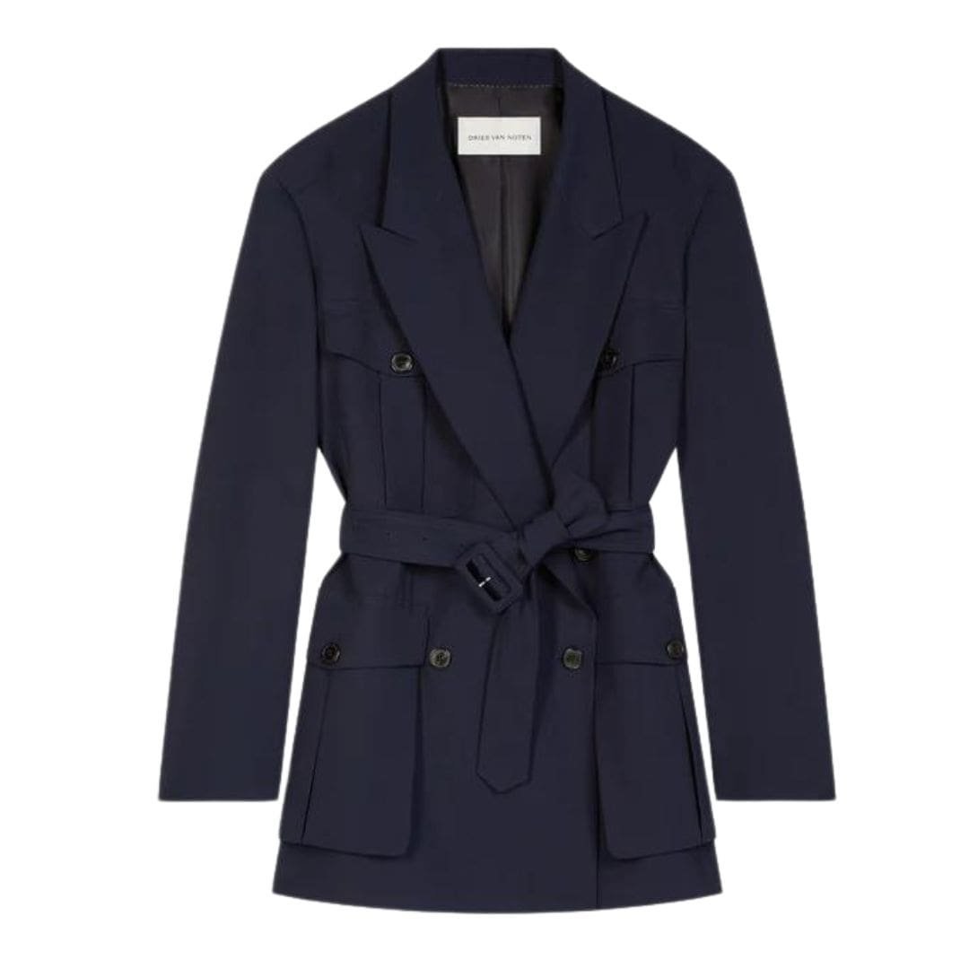In summary, the Dries Van Noten Oversized Belted Coat in Navy is a luxurious outerwear piece that combines comfort, style, and functionality. Its premium materials, thoughtful design details, and versatile silhouette make it a standout addition to any wardrobe, perfect for elevating your look in any season.