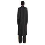 Elevating the coat’s aesthetic are the distinctive pagoda shoulders, which add a touch of architectural flair and lend a regal air to the ensemble. Meanwhile, the front jetted pockets and welt pocket at the chest offer both style and functionality, providing convenient storage for small essentials while maintaining a clean, streamlined silhouette.