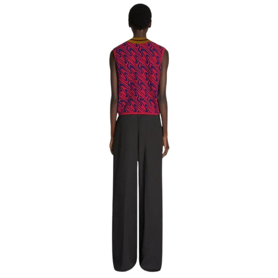 Dries Van Noten V-Neck Spencer Red. merges luxurious materials with intricate design elements, crafted from a blend of 44% Viscose, 38% Merino Wool, and 18% Polyester. Featuring a swirly jacquard motif, contrast rib details, a regular fit, a sleeveless design, and a V neckline, this Spencer offers a blend of sophistication and comfort.