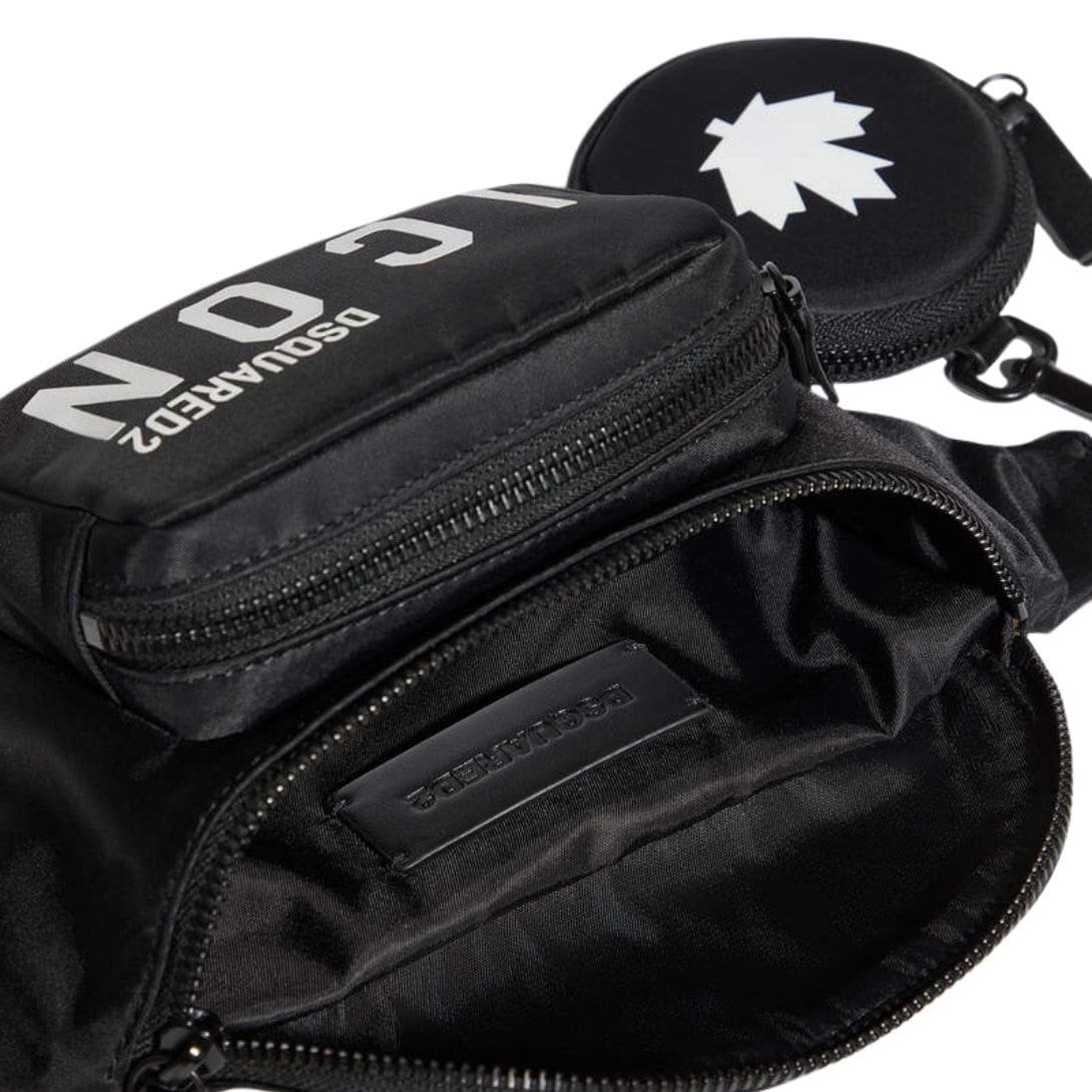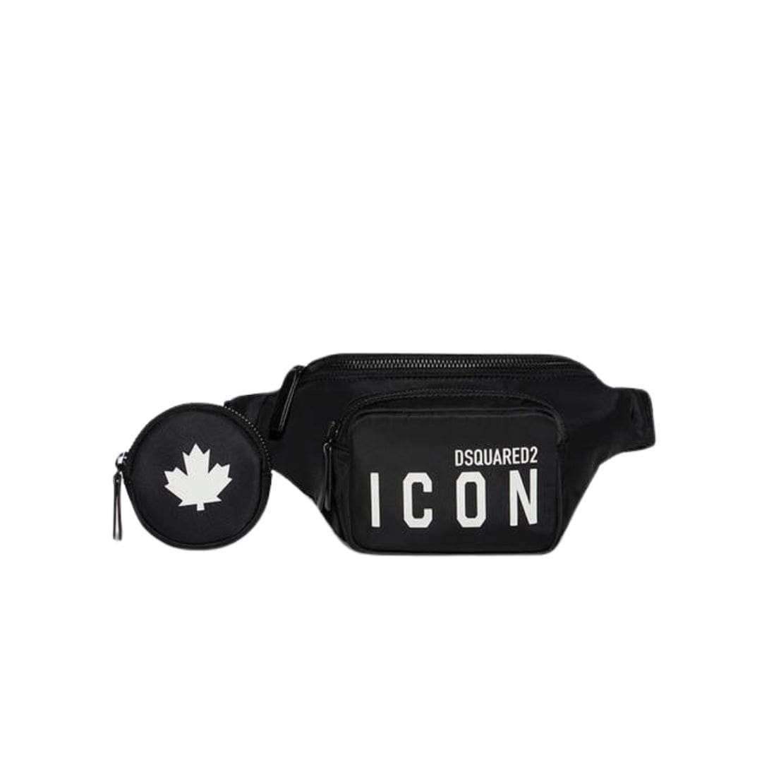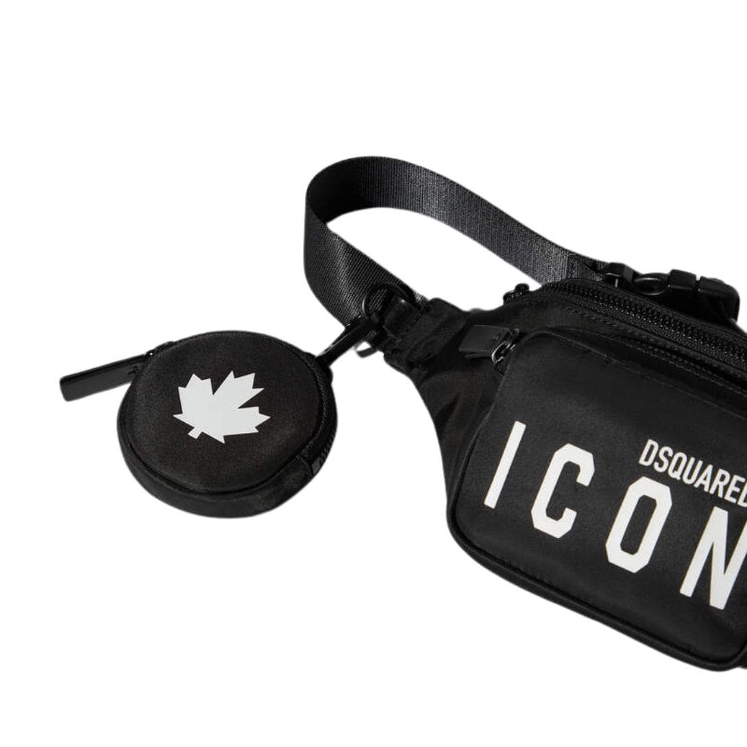 One of the standout features of this belt bag is its bold branding. The front prominently displays the “Be Icon” slogan, a signature element of DSQUARED2’s collections, which adds a statement-making touch to the accessory. This iconic branding is typically rendered in contrasting colors or textures, ensuring it catches the eye and enhances the bag’s visual appeal.