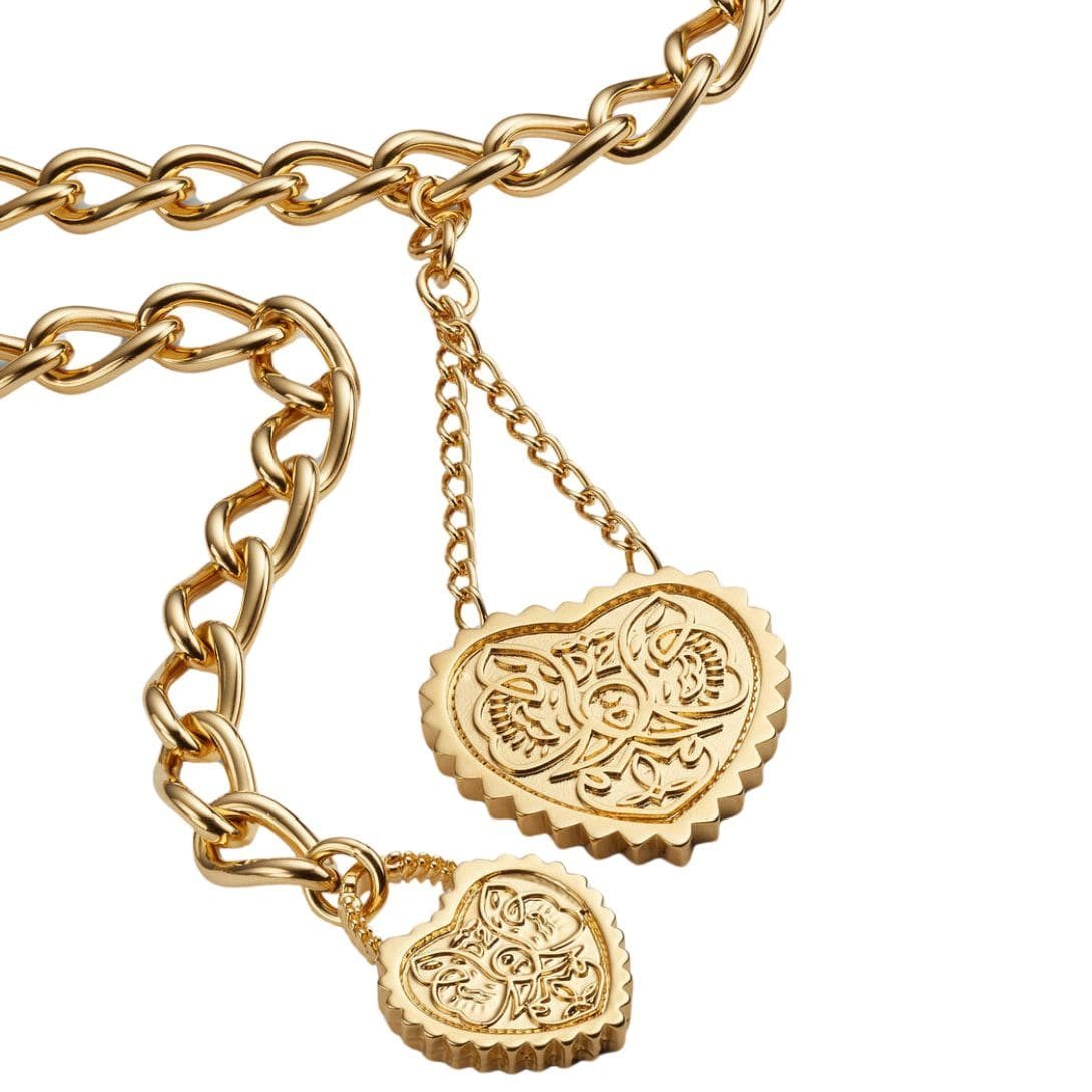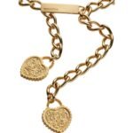 At the heart of this exquisite belt lies its distinctive chain construction, which is both sturdy and visually captivating. Each link is intricately crafted to form a continuous chain that drapes effortlessly around the waist, creating a striking silhouette. The chains are delicately intertwined to form a series of heart motifs, adding a playful yet sophisticated element to the design.