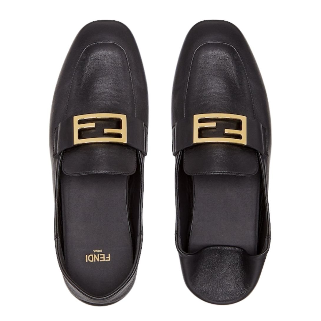 Crafted from premium black leather, these loafers feature the signature FF Baguette motif for a subtle yet recognizable touch. A unique foldable heel design allows you to transition them into sabots, enhancing versatility. The suede sole, complemented by raised rubber inserts, ensures a secure grip and comfort during wear. Finished with gold-finish metalware, these loafers exude understated elegance.