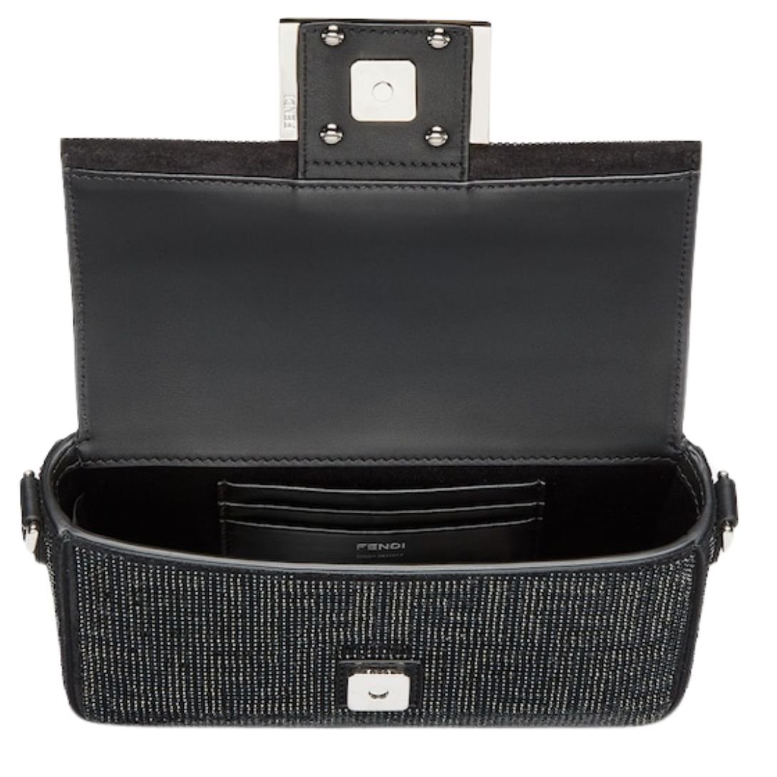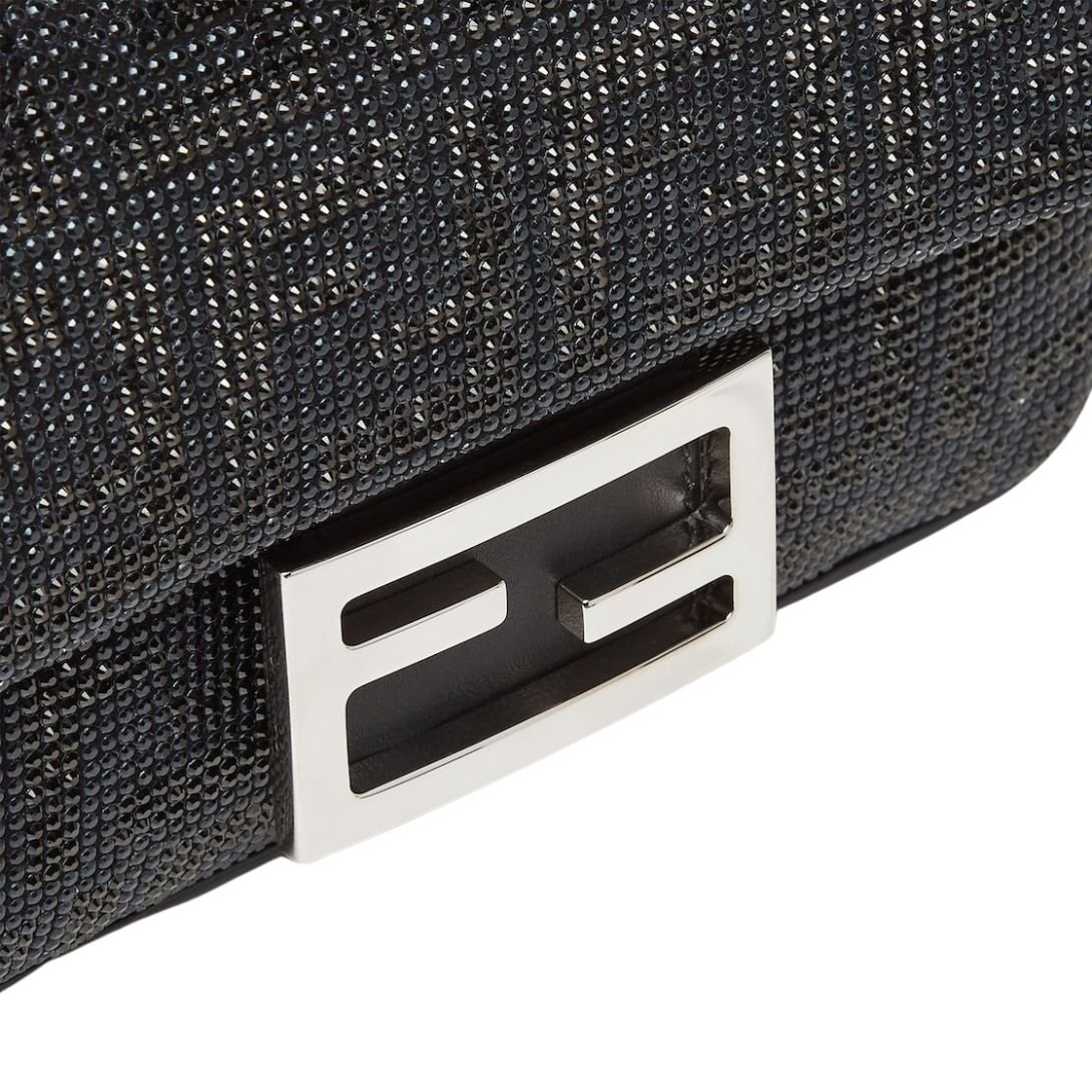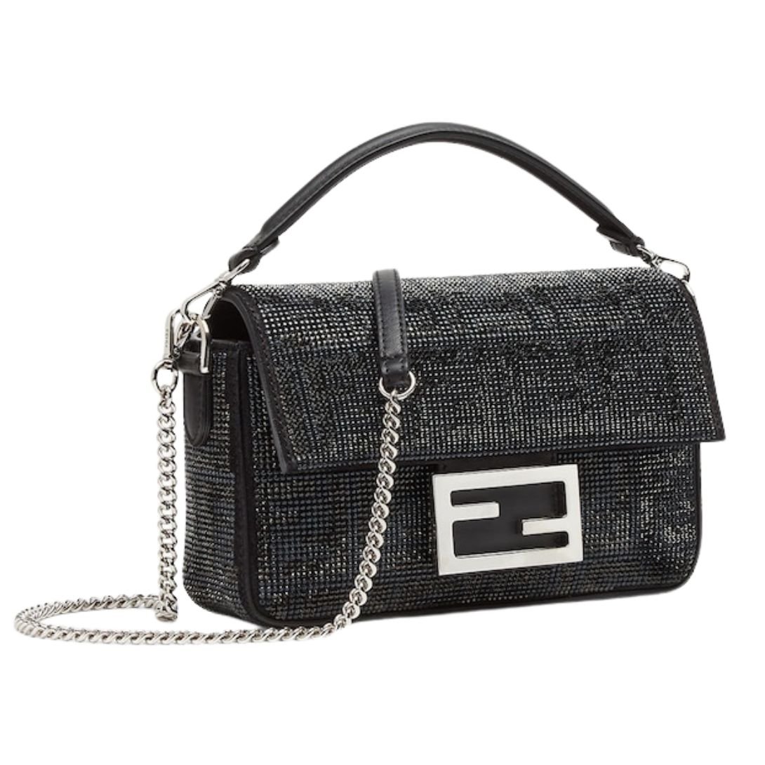 The Iconic Small Baguette Bag is a dazzling blend of luxury and design, featuring suede construction, intricate crystal and multi-faceted stud detailing that forms the signature FF motif in black. Finished with an FF clasp, this bag makes a bold fashion statement.