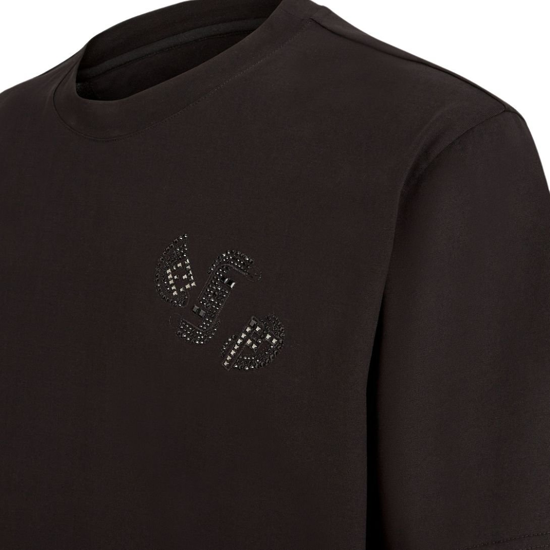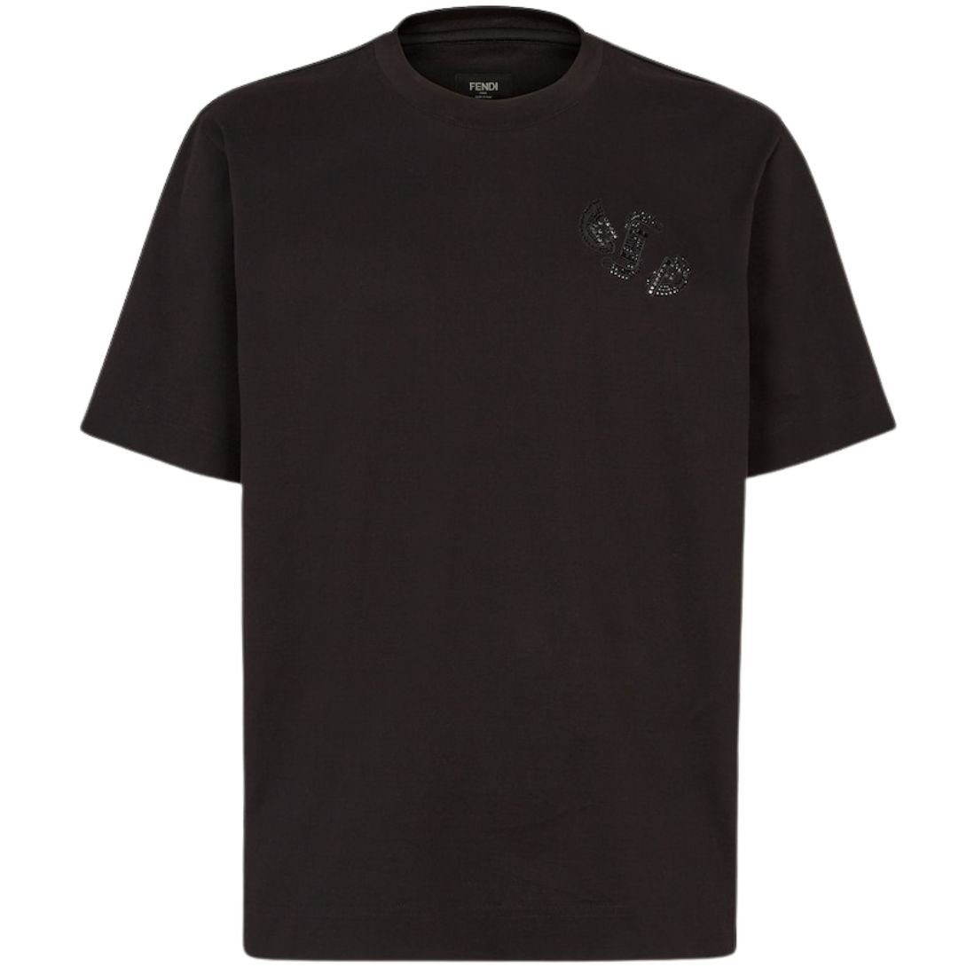 The T-shirt is beautifully customized with a Fendi Jewels motif, designed using rhinestones of various sizes and shapes. The rhinestone embellishment adds a touch of sparkle and sophistication, creating an eye-catching and luxurious effect. The shimmering details elevate the T-shirt, transforming it into a statement piece.