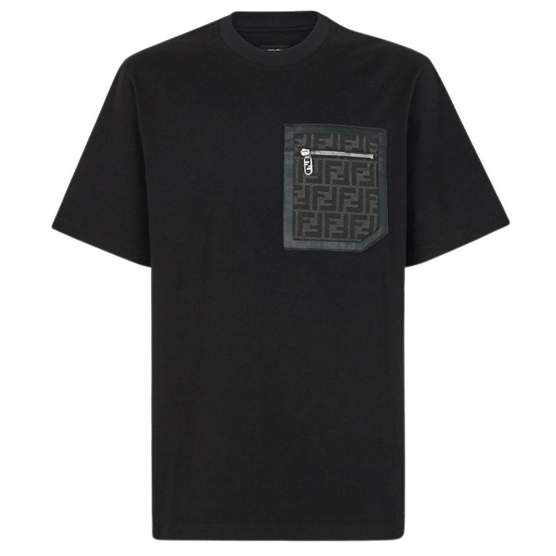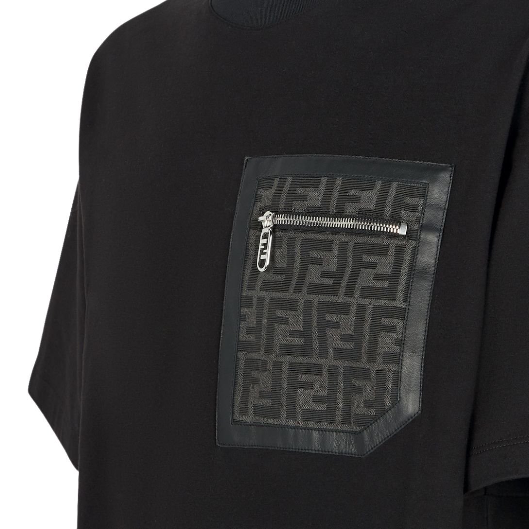 This skater-style T-shirt features a classic crew neck and short sleeves, offering a casual and comfortable fit. The standout detail is the zipper pocket on the chest, enhanced with a jacquard FF fabric insert and leather trim in matching tones for a signature, high-end touch.