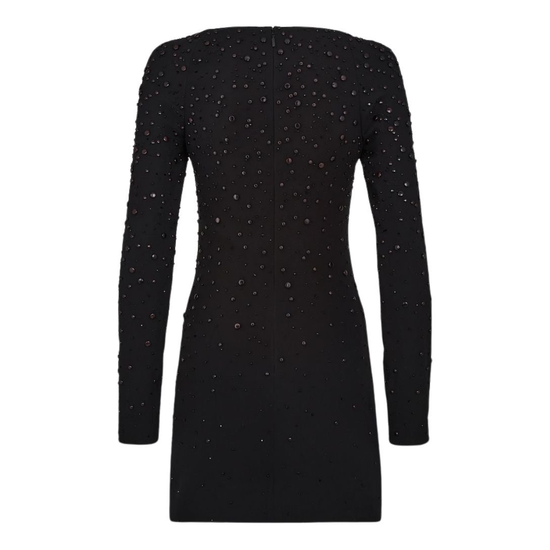 This close-fitting short dress features a square neckline and long sleeves, designed to offer both elegance and a touch of modern sophistication. Crafted from luxurious black silk cady, the dress is adorned with a stunning array of matt pearls in varying sizes, creating an ombré effect that enhances its visual depth and texture.