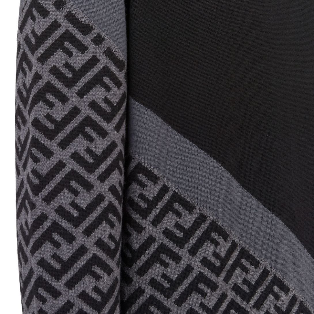 This regular-fit crew-neck sweater features a contemporary aesthetic with a blend of bold design elements. Crafted from black wool, it offers a sleek, minimalist look that is versatile for both casual and semi-formal occasions. The sweater is adorned with a unique Fendi Diagonal insert across the front and right sleeve, incorporating shades of light gray and black along with tonal color block stripes. These distinctive design elements elevate the sweater, offering a modern twist on a classic style.