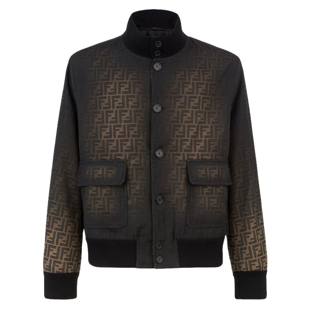 Made from fabric with the distinctive jacquard FF Eclissi motif, the jacket showcases a hand-shaded finish at the edges, offering a sophisticated and contemporary look. The black ribbed knit collar, cuffs, and hem create a contrasting detail, adding a sporty yet elegant touch.