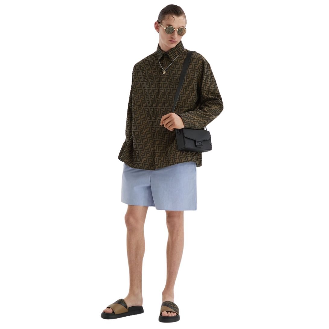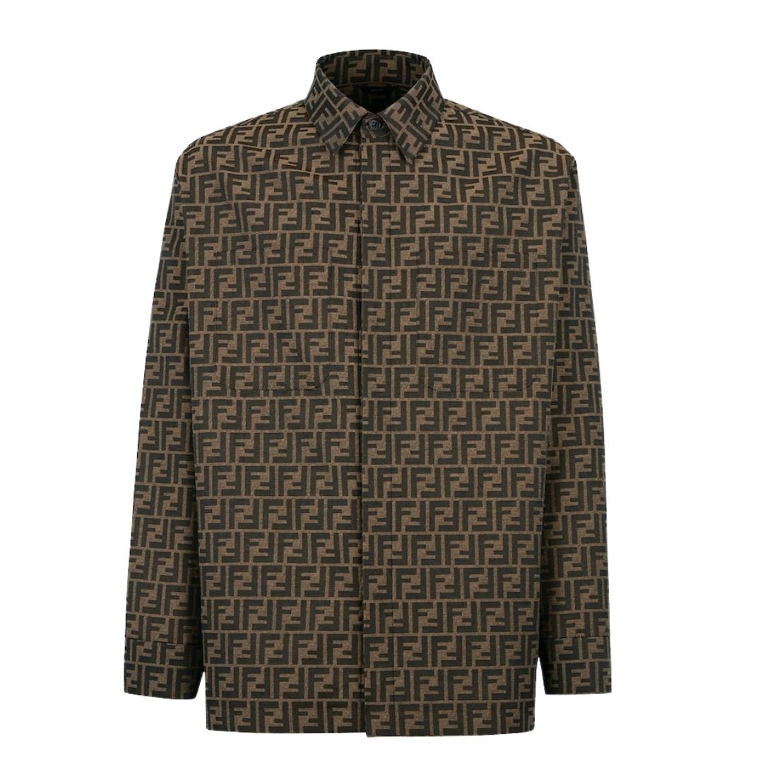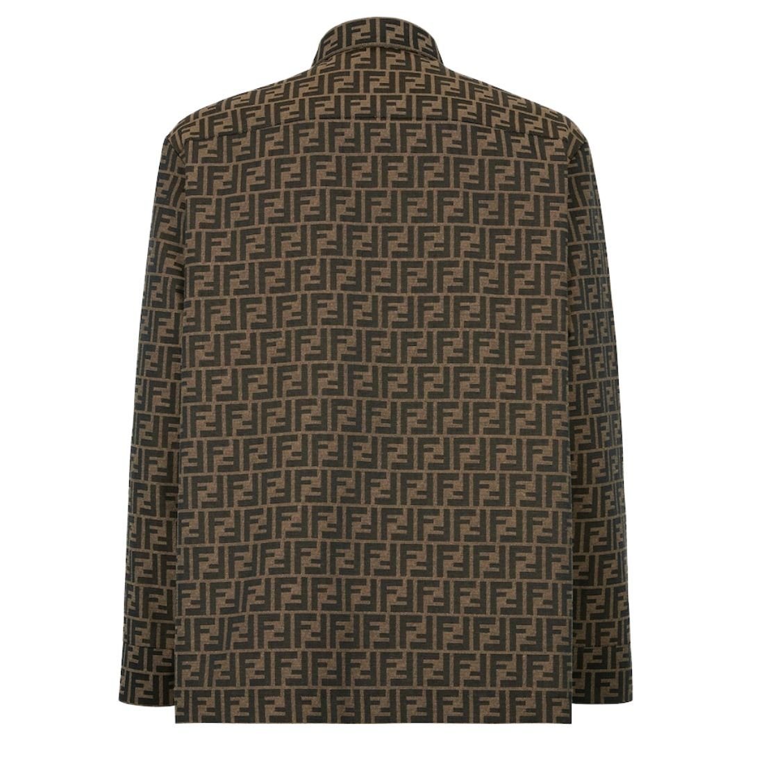 This jacket, made from brown fabric featuring an all-over jacquard FF motif, merges timeless tailoring with a bold design. The shirt collar and patch pockets on the chest offer a classic look, while the oversized fit gives it a contemporary, relaxed vibe.
