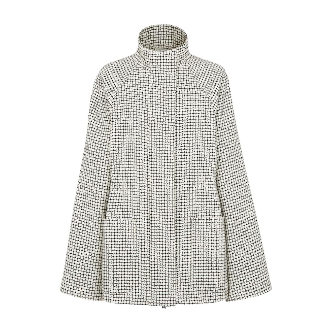 Crafted from a wool fabric with a black and white check motif, this piece offers a timeless yet contemporary look. The material ensures warmth and durability, making it a versatile outerwear option.
