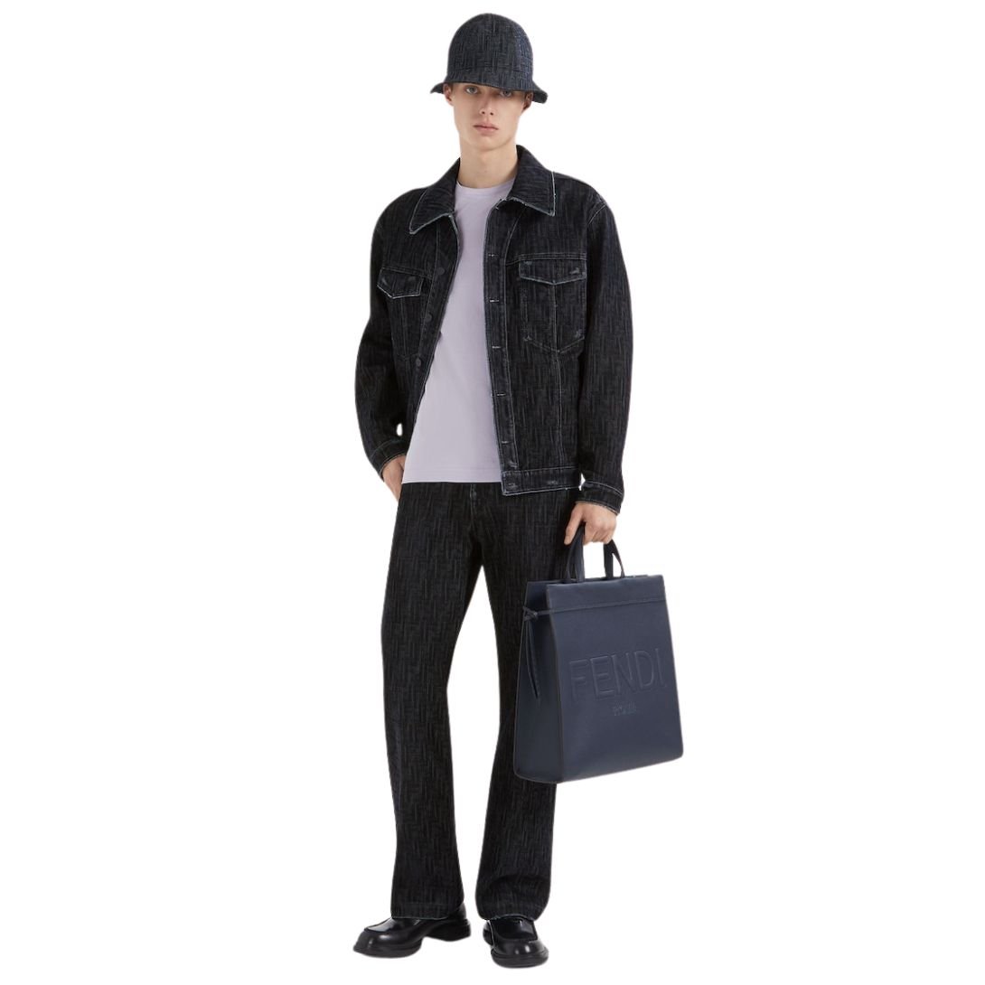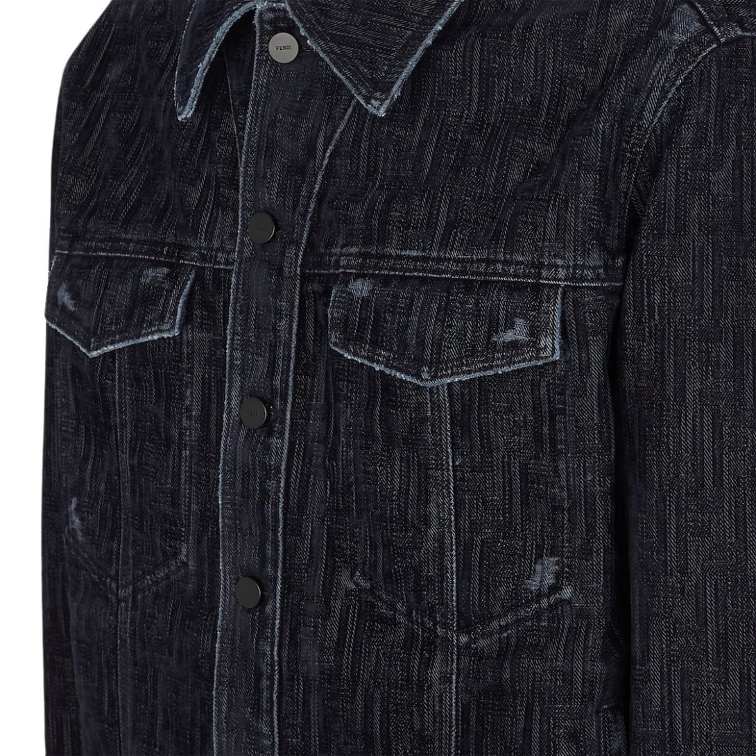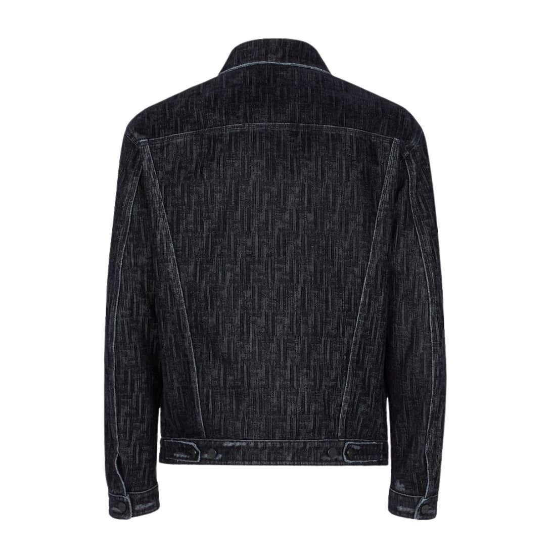 Crafted from blue denim, the jacket is elevated with an all-over flocked FF motif, creating a subtle yet bold statement. This signature design element adds depth and texture, setting it apart from standard denim jackets.