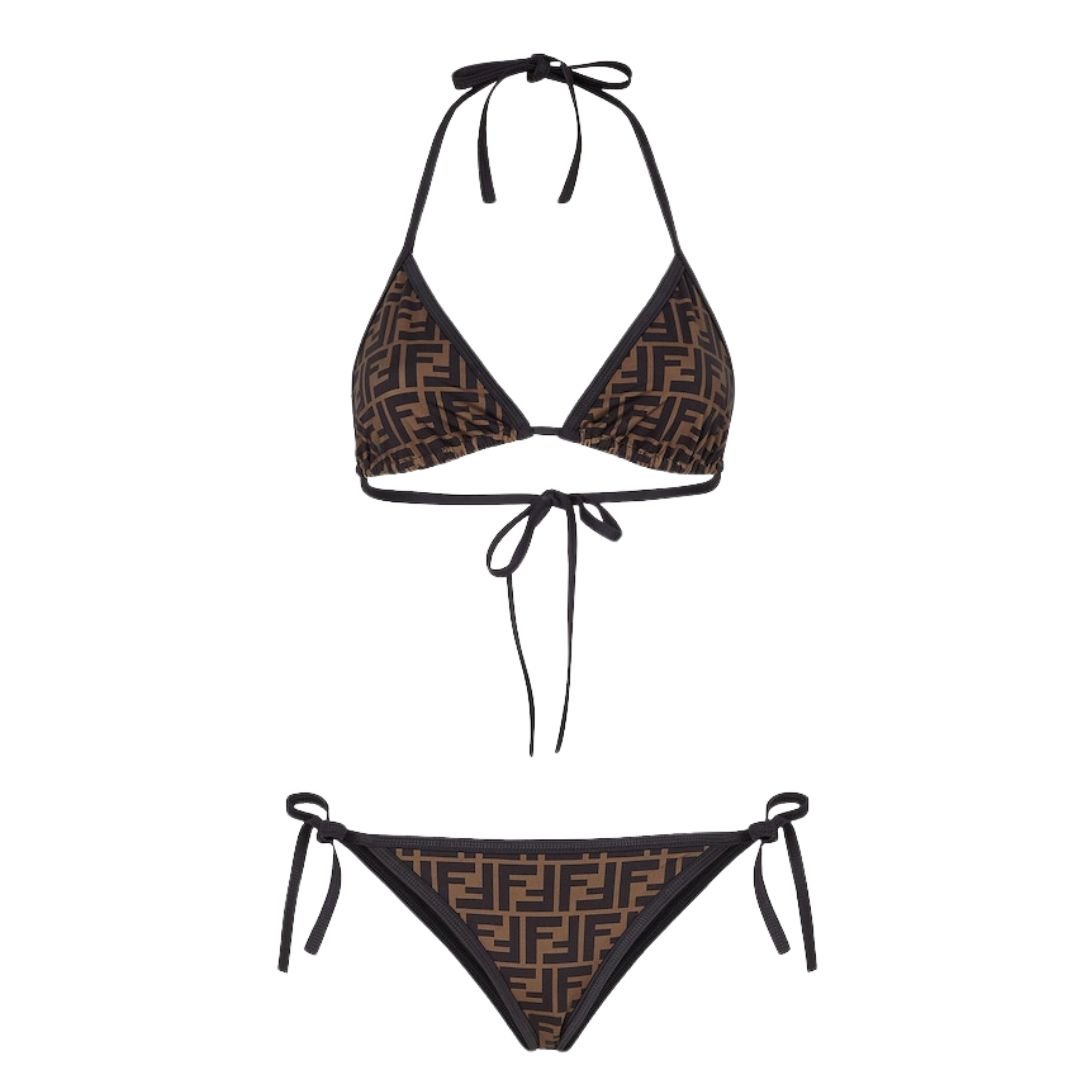 This bikini features a classic triangle top paired with adjustable side-lacing briefs, offering a customizable fit. Crafted from brown Lycra adorned with the iconic full FF motif, it is elegantly accented with contrasting black profiles, adding a bold and polished finish.