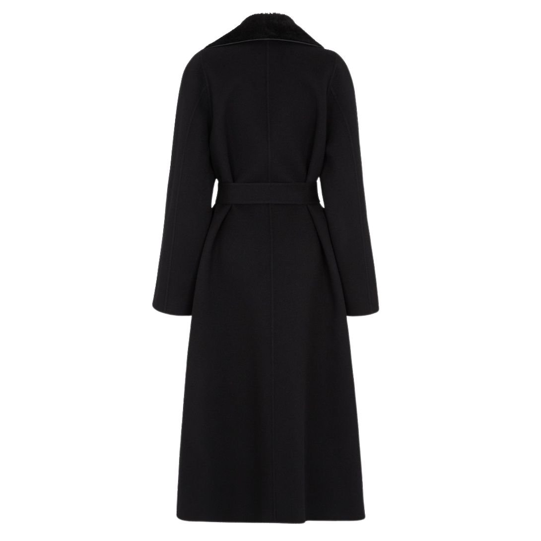 Crafted from luxurious black wool double fabric, this coat provides warmth and a refined appearance. The black shaved sheepskin collar and facing add a unique, tactile element, enhancing its sophisticated design.