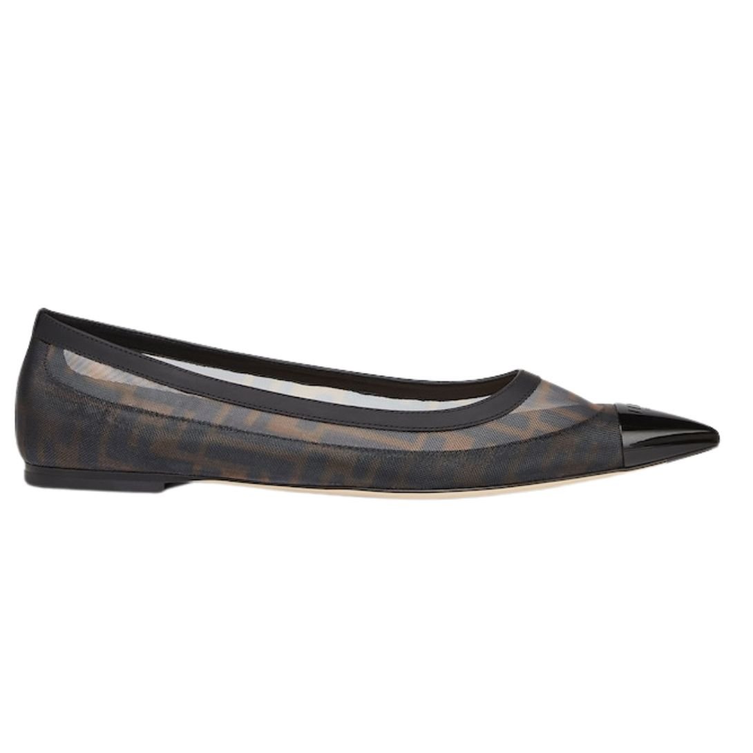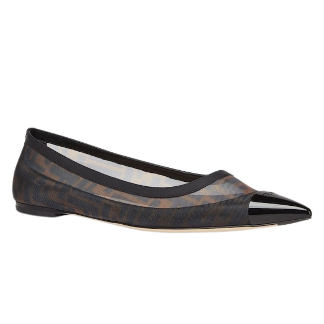 FENDI COLIBRÌ BLACK LEATHER AND BROWN FF MESH BALLET FLATS